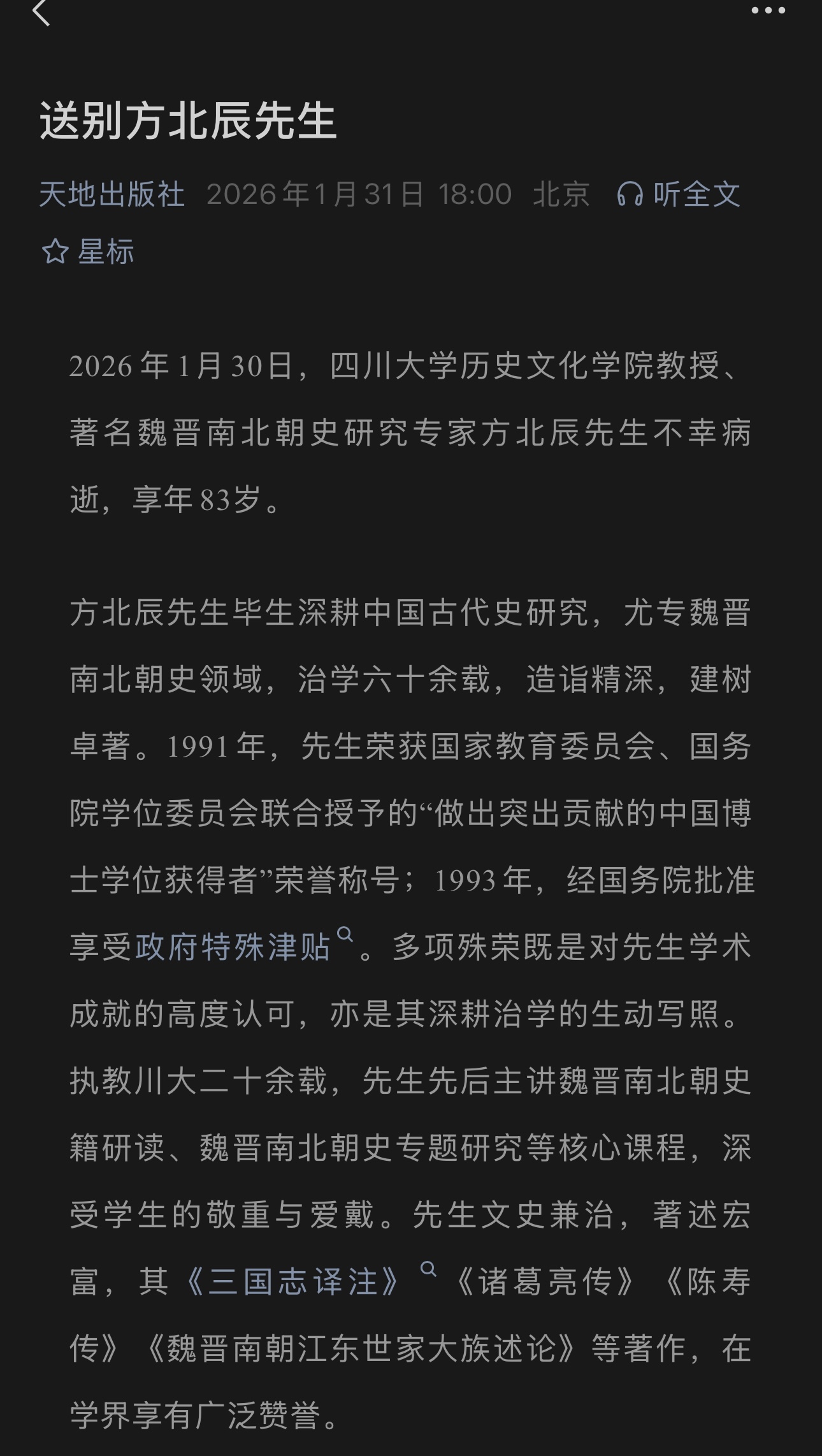 1月30日,四川大学对外发布讣告:四川大学历史文化学院教授、著名魏晋南北朝史研究专家方北辰先生,因病医治无效,于2026年1月30日在成都逝世,享年83岁。1月31日晚,天地出版社官方微信公众号发布推文《送别方北辰先生》。
