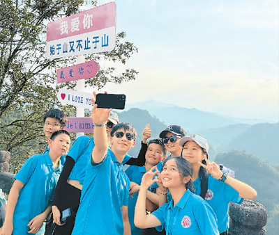 福建集结营的营员们在福建省武夷山市天游峰顶合影留念。 本报记者 高 乔摄