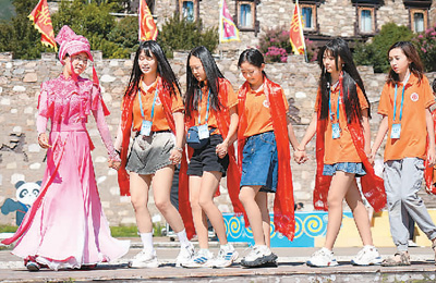 四川集结营的营员在四川省阿坝藏族羌族自治州茂县中国古羌城体验羌族萨朗舞。 卢欣奕摄