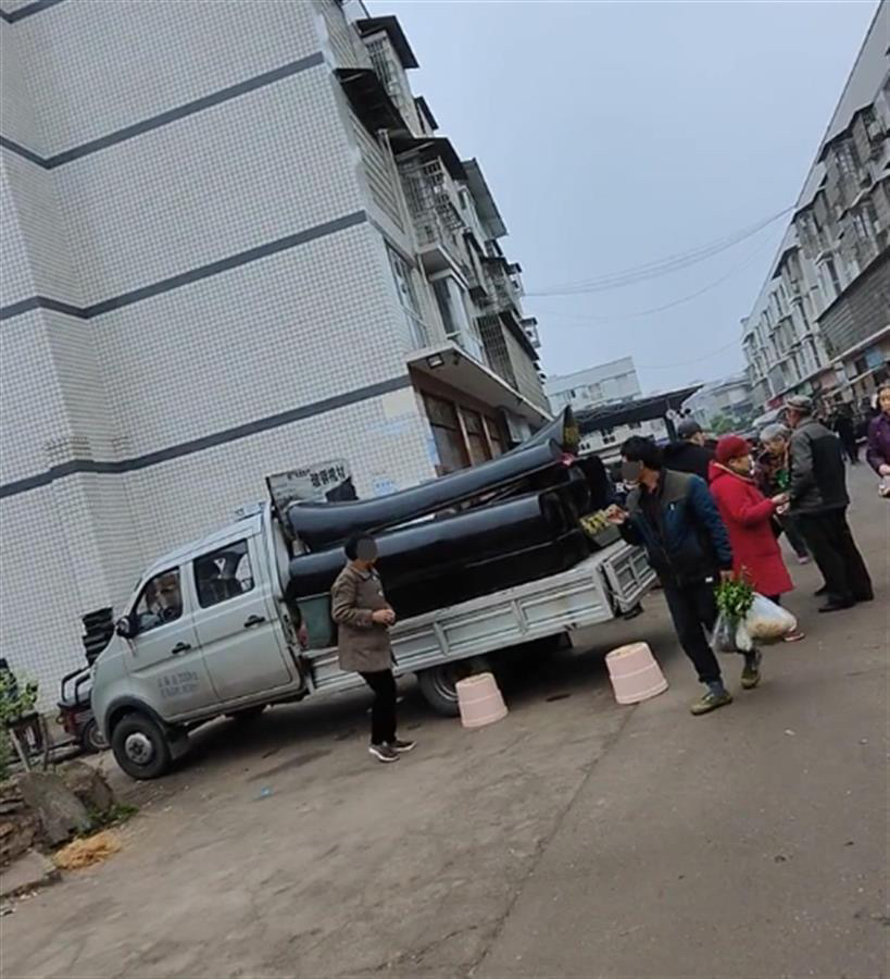 该村民称,车上摆了两副棺材,黑色的,开始还有很多人围着看热闹,后来没多久就离开了,“地方都没选对,农贸市场哪里准你来卖棺材嘛!”