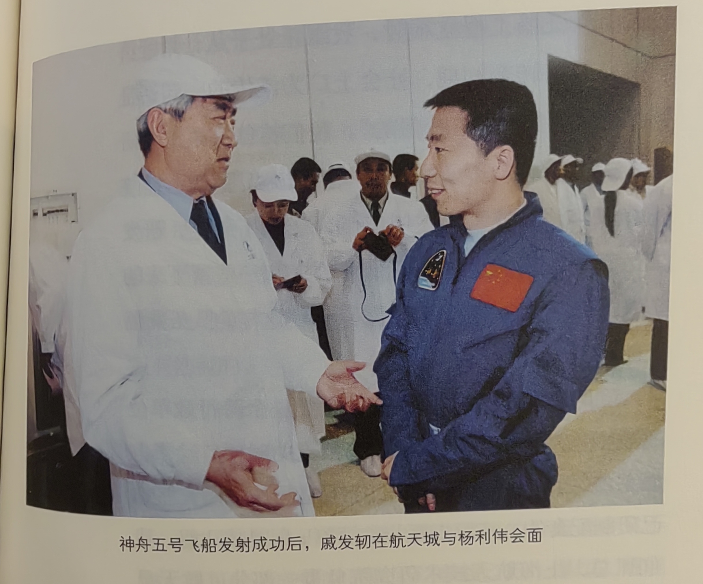 神舟五号飞船发射成功后,戚发轫在航天城与杨利伟会面(翻拍)