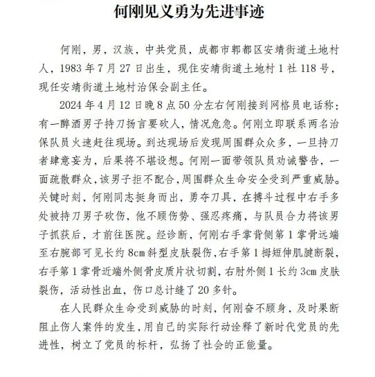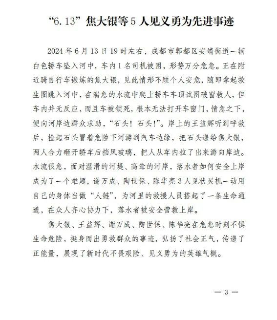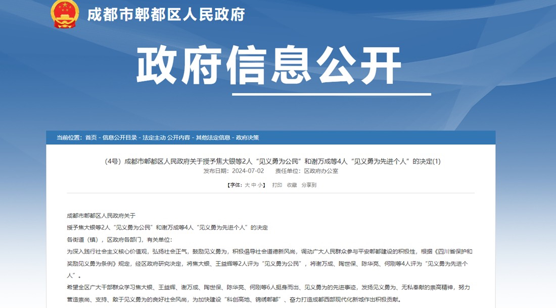 7月3日,封面新闻记者从成都市郫都区获悉,成都市郫都区人民政府已于7月2日发布公示,授予焦大银和王益辉2人“见义勇为公民”,谢万成、陶世保、陈华亮、何刚等4人评为“见义勇为先进个人”。