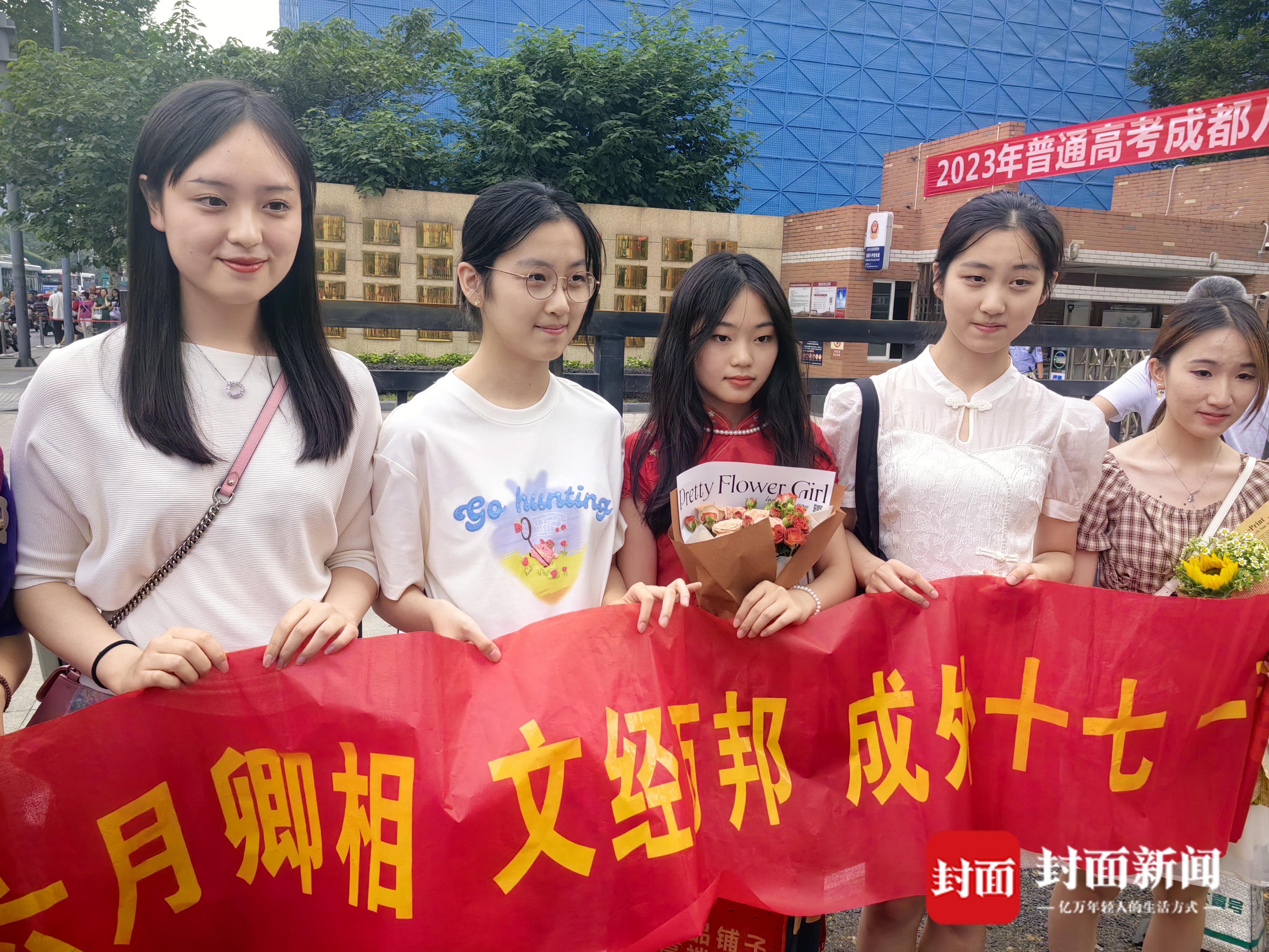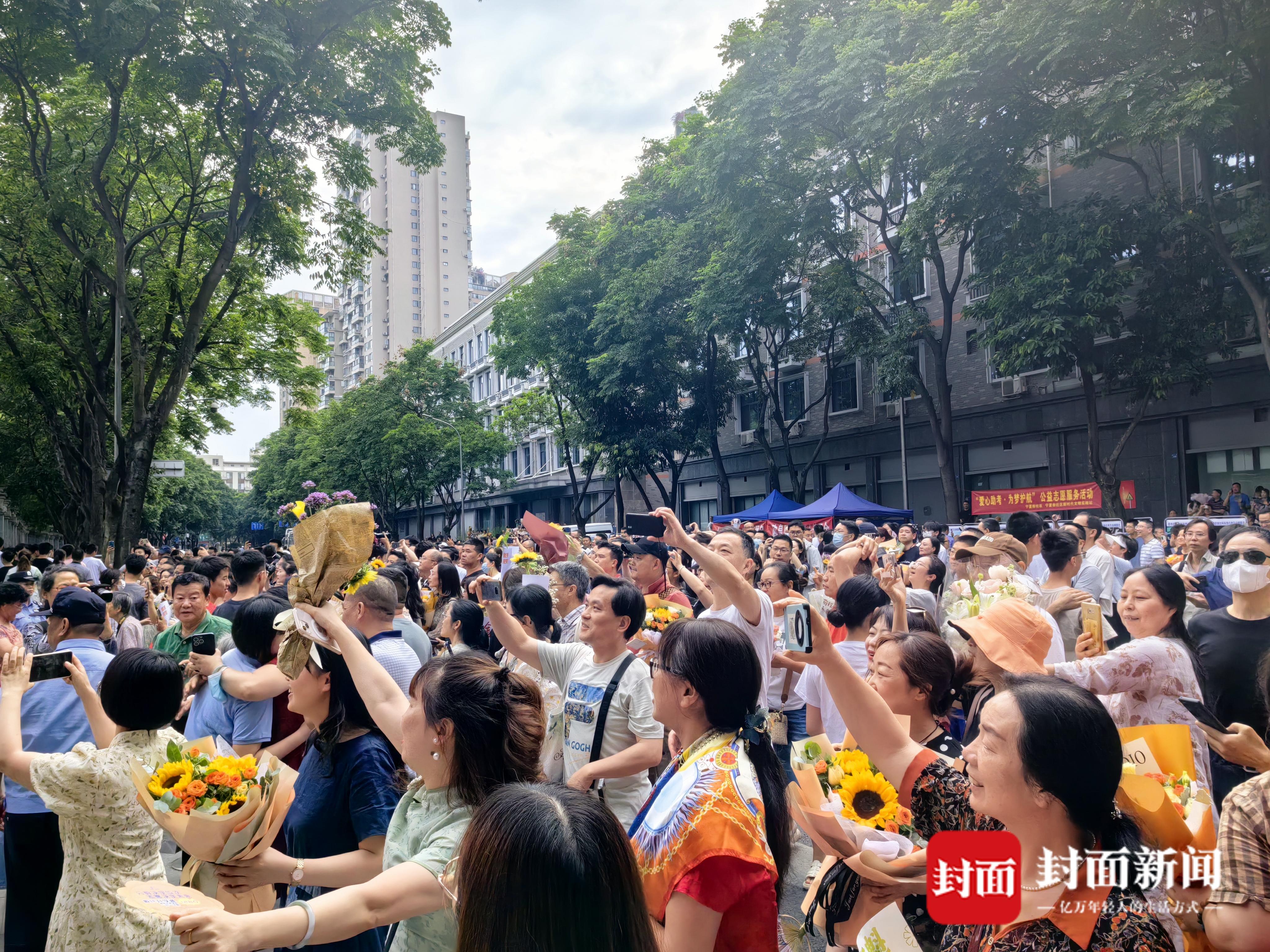 来自成都外国语学校的八位同学也在等待着,此前他们已保送不同院校,此次专程赶赴考点,就是为了给参加完高考的同班同学们一个惊喜,高三(17)班的夏文静准备了一大束栀子花,“这是他们很重要的一个时刻,希望他们接下来能好好享受假期。”