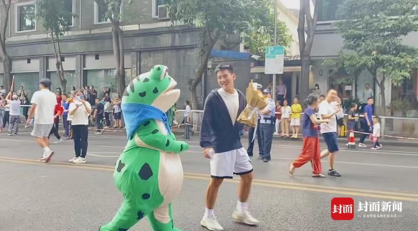 在众多 “亲友团”中,一位穿着青蛙衣服的家长拉着考生欢喜地往学校外走,这是一位“社牛”小姨为侄儿准备的惊喜,“穿青蛙衣服是想给他一个惊喜,希望他金榜题名,永远赤诚勇敢”。