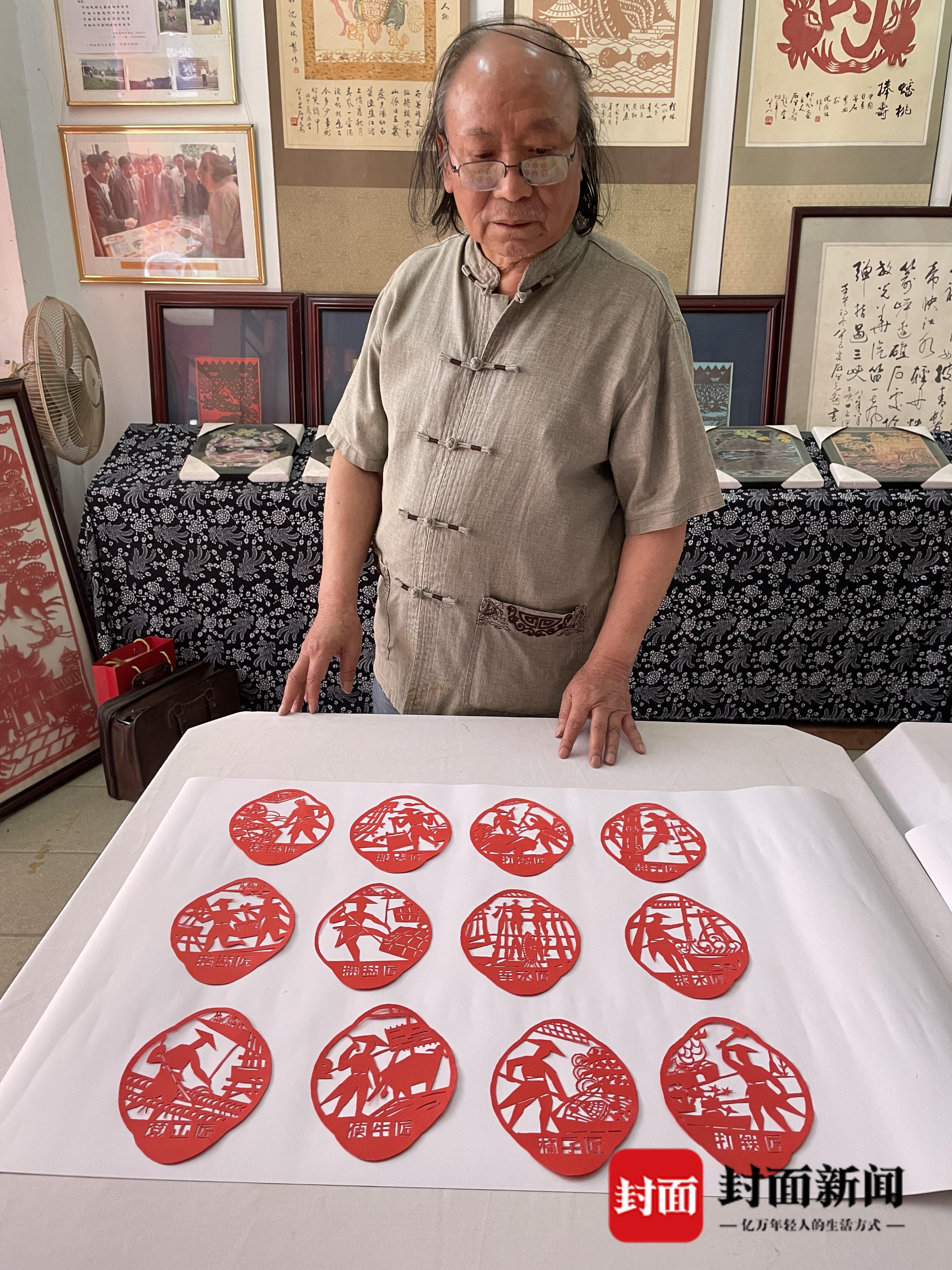 “这十二大工匠,代表了过去自贡盐场最核心的工艺流程。”5月24日,省级非遗自贡剪纸代表性传承人沈成林在位于自流井釜溪步行街的工作室里,摊开十二幅栩栩如生的剪纸作品,这是他刚刚完成的“千年盐场十二大工匠”系列作品,也是他个人剪纸作品代表作三部曲之一。同时,在自贡的各种艺术形式当中,专门聚焦盐场工匠、讲述工匠故事的艺术作品也属罕见。