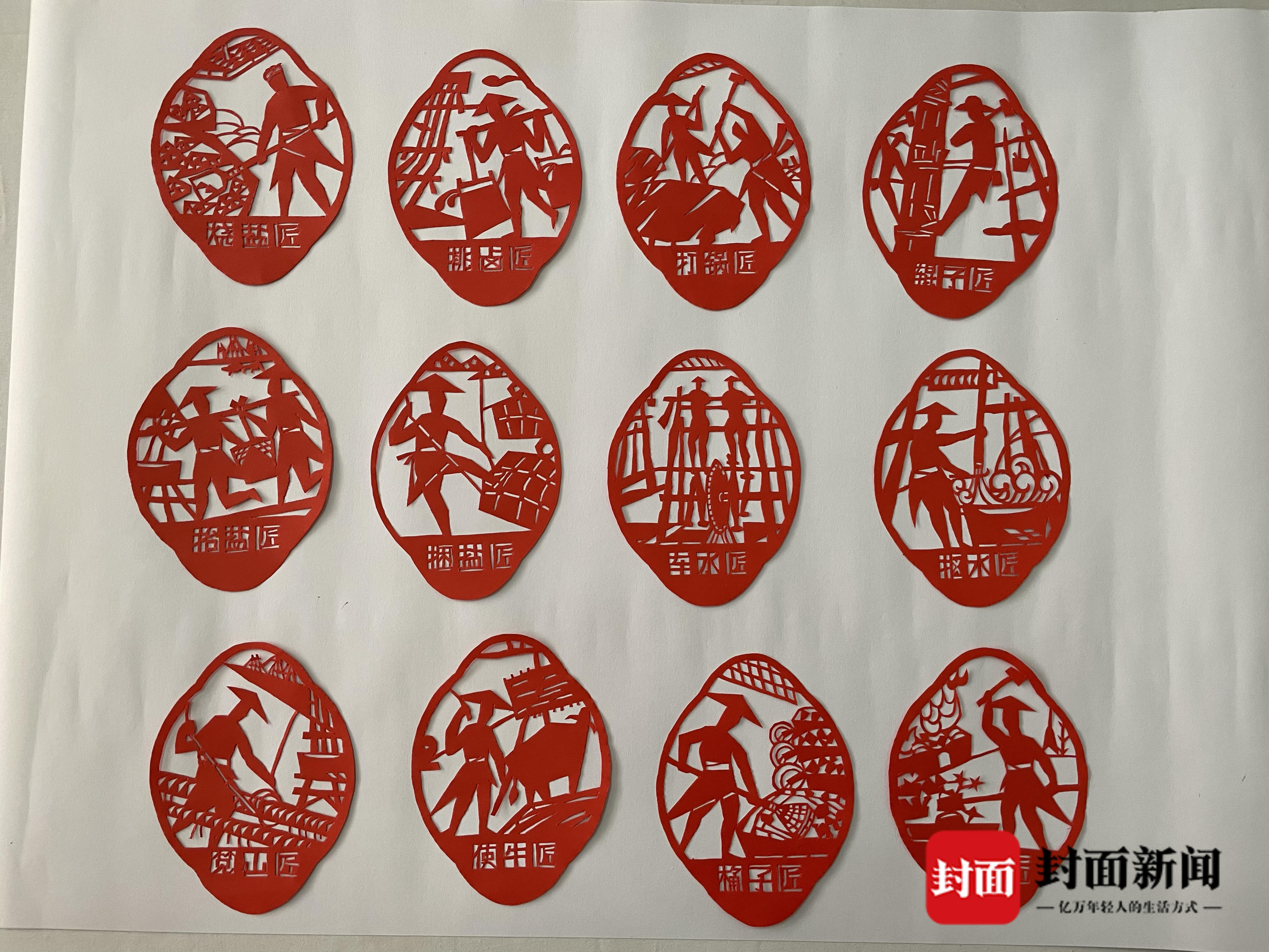 “我父亲曾是一名笕山匠,我从小就出生在自流井郭家坳废旧的盐仓,出门就是老盐厂。这些从小耳濡目染的画面,让我萌生了创作一个老盐场工匠系列群像的想法。”在沈成林的面前,摆放着十二幅精致的剪纸作品。