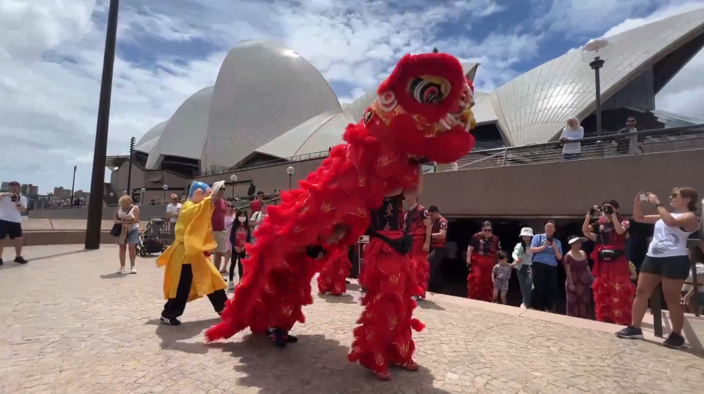 图为悉尼歌剧院前的醒狮表演。