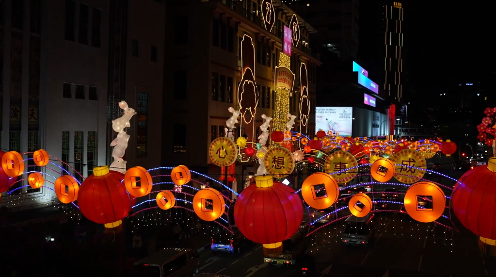 图为张灯结彩的新加坡牛车水。