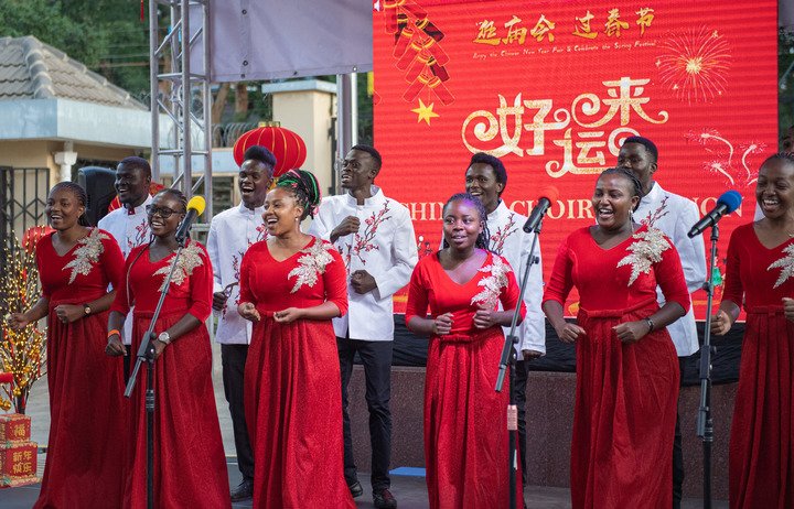 1月19日,在肯尼亚首都内罗毕,内罗毕孔子学院的学生在“逛庙会、过春节”春节体验活动上表演中国歌曲。新华社记者 李亚辉 摄