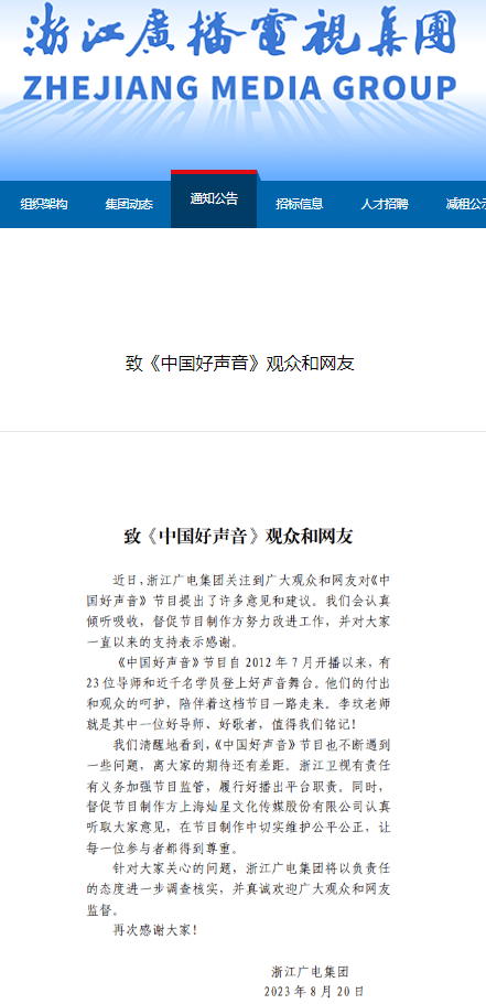 对此事件,8月20日晚,浙江广播电视集团网站发布《致〈中国好声音〉观众和网友》,称针对大家关心的问题,浙江广电集团将以负责任的态度进一步调查核实,并真诚欢迎广大观众和网友监督。