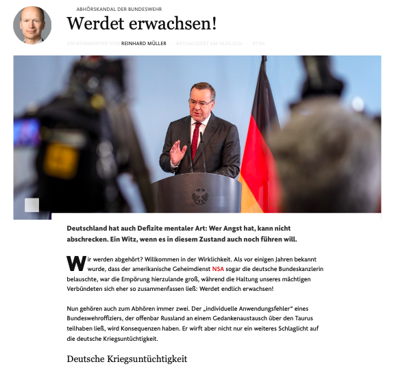 德国《法兰克福汇报》日前发表的评论文章将此次“窃听门”事件与前几年爆出的美国国家安全局监听前总理默克尔等德国高层联系到一起,称由此可见,“德国根本没有做好战争准备——既没有能力,也没有自主权。”