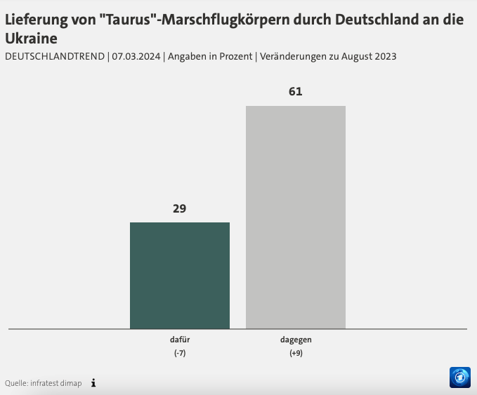 根据德国电视一台当地时间7日公布的最新“德国趋势”民调,在“窃听门”事件发生后,61%的德国民众反对向乌克兰提供“金牛座”巡航导弹,较去年8月的民调结果增长了9%;支持的民众数量减少了7%,占比仅为29%。民调还显示,70%的受访者担心间谍活动增加,67%的人担心德国对此缺乏准备,还有62%的民众担心德国可能会直接卷入战争。