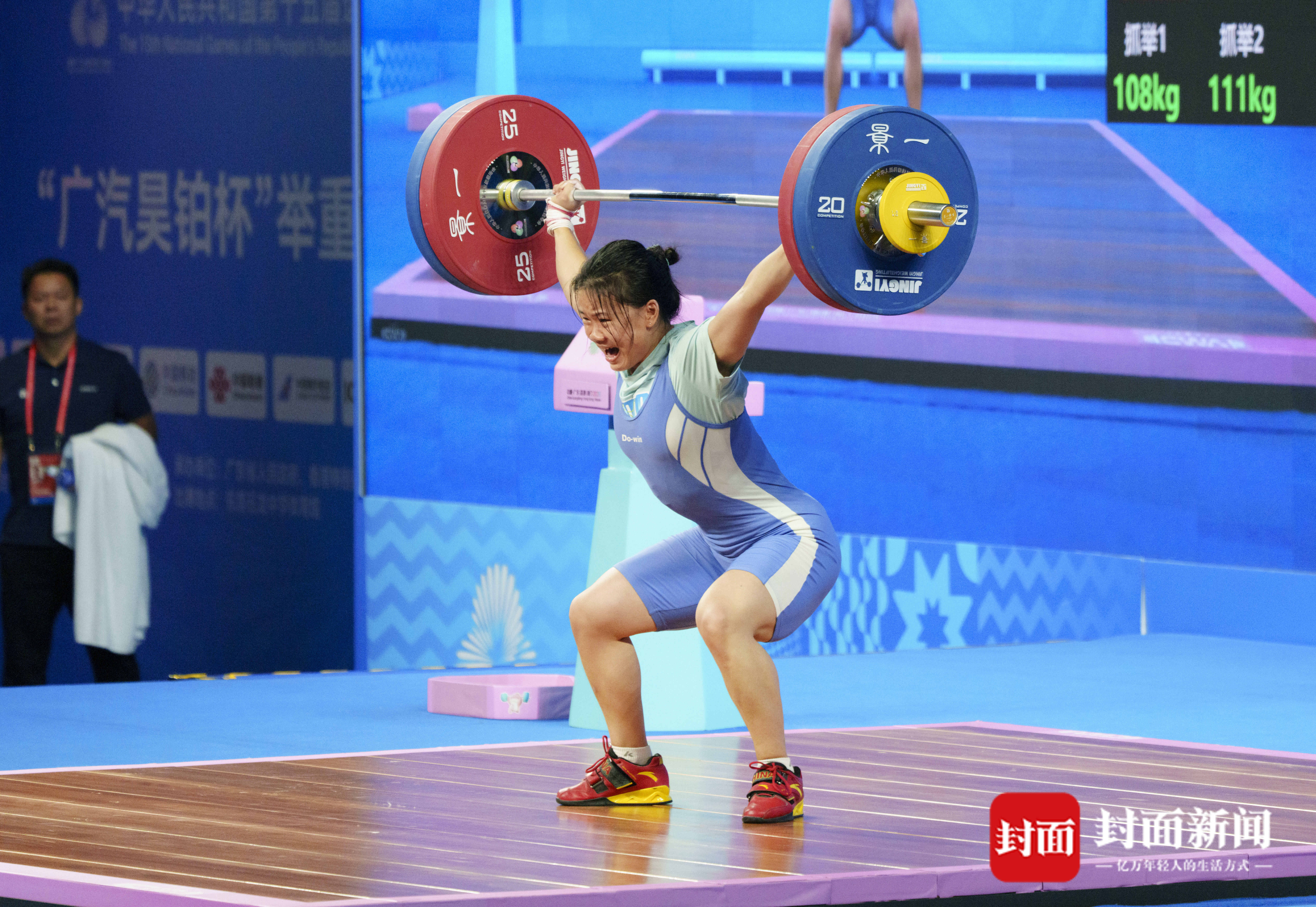抓举环节,方淋凭借稳定的发挥,三次抓举试举悉数成功,以113公斤的成绩位列抓举首位。挺举比赛中,方淋、李霜和杨柳月的开把重量均为130公斤,三人都成功举起,至此三人已确定站上领奖台。