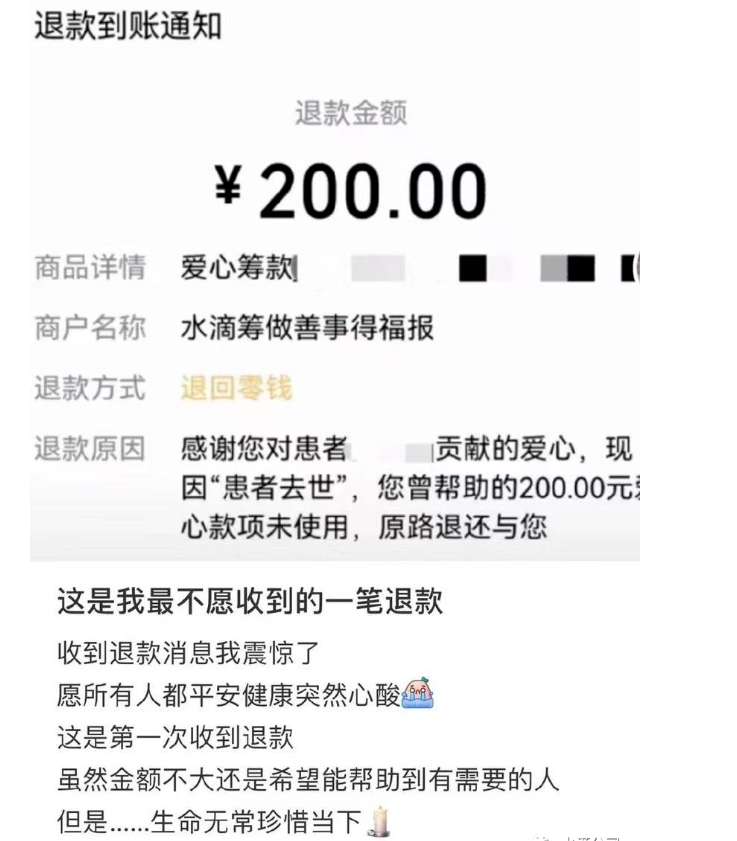 近几日,有网友“超级无敌小学生”发出了两张水滴筹用户的退款到账截图,一个退款到账50元,一个退款到账200元。退款的原因追溯起来,很简单却也很唏嘘:他们帮助的患者已经去世,不再需要这笔钱。平台将这部分善款原路退回给了捐款人。