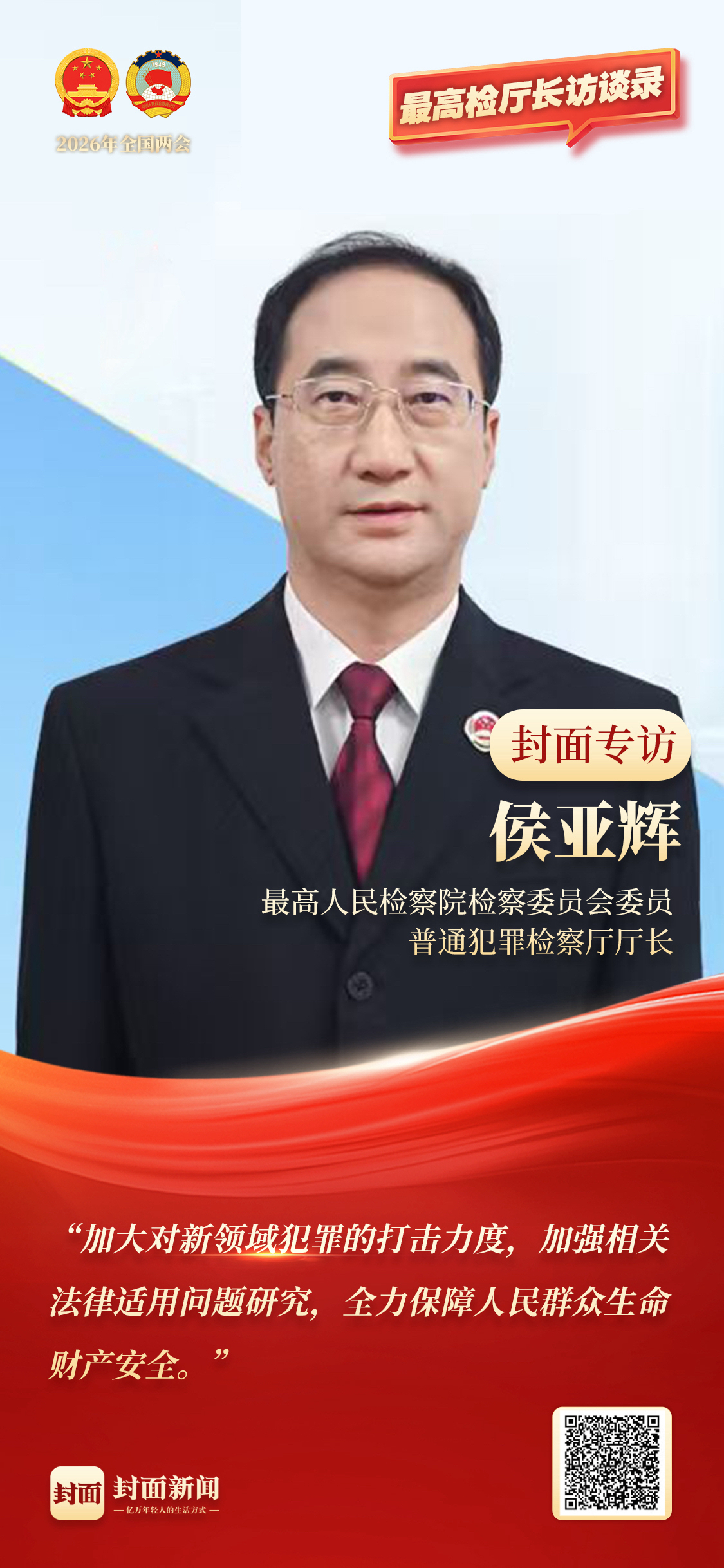 2026年全国两会期间,最高人民检察院检察委员会委员、普通犯罪检察厅厅长侯亚辉在接受封面新闻记者专访时表示,检察机关将加大对新领域犯罪的打击力度,加强相关法律适用问题研究,全力保障人民群众生命财产安全,不断增强人民群众获得感、幸福感、安全感。