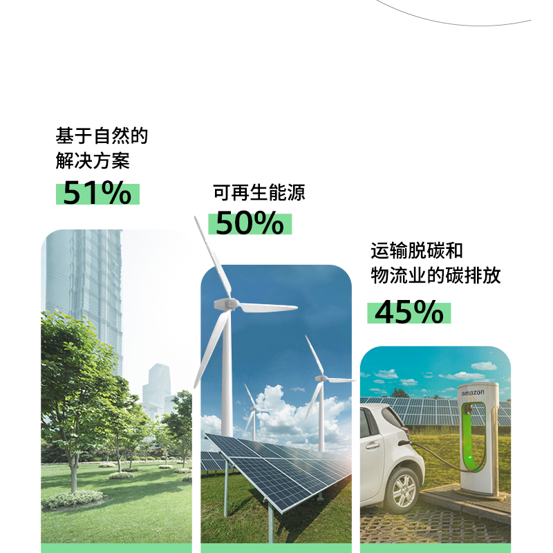 2019 年,亚马逊与 Global Optimism组织联合发布了《气候宣言》,承诺比《巴黎协定》提前十年实现净零碳排放。 目前,已有来自34个国家、54个行业的375家企业签署《气候宣言》,包括IBM、微软、百事可乐、联合利华、Visa等。 气候宣言的成员企业承诺:定期测量与报告温室气体排放情况;通过商业变革和创新举措落实《巴黎协定》的脱碳目标;通过额外可量化、切实可行、持久的,且对社会有益的抵消举措来中和剩余的碳排放。
