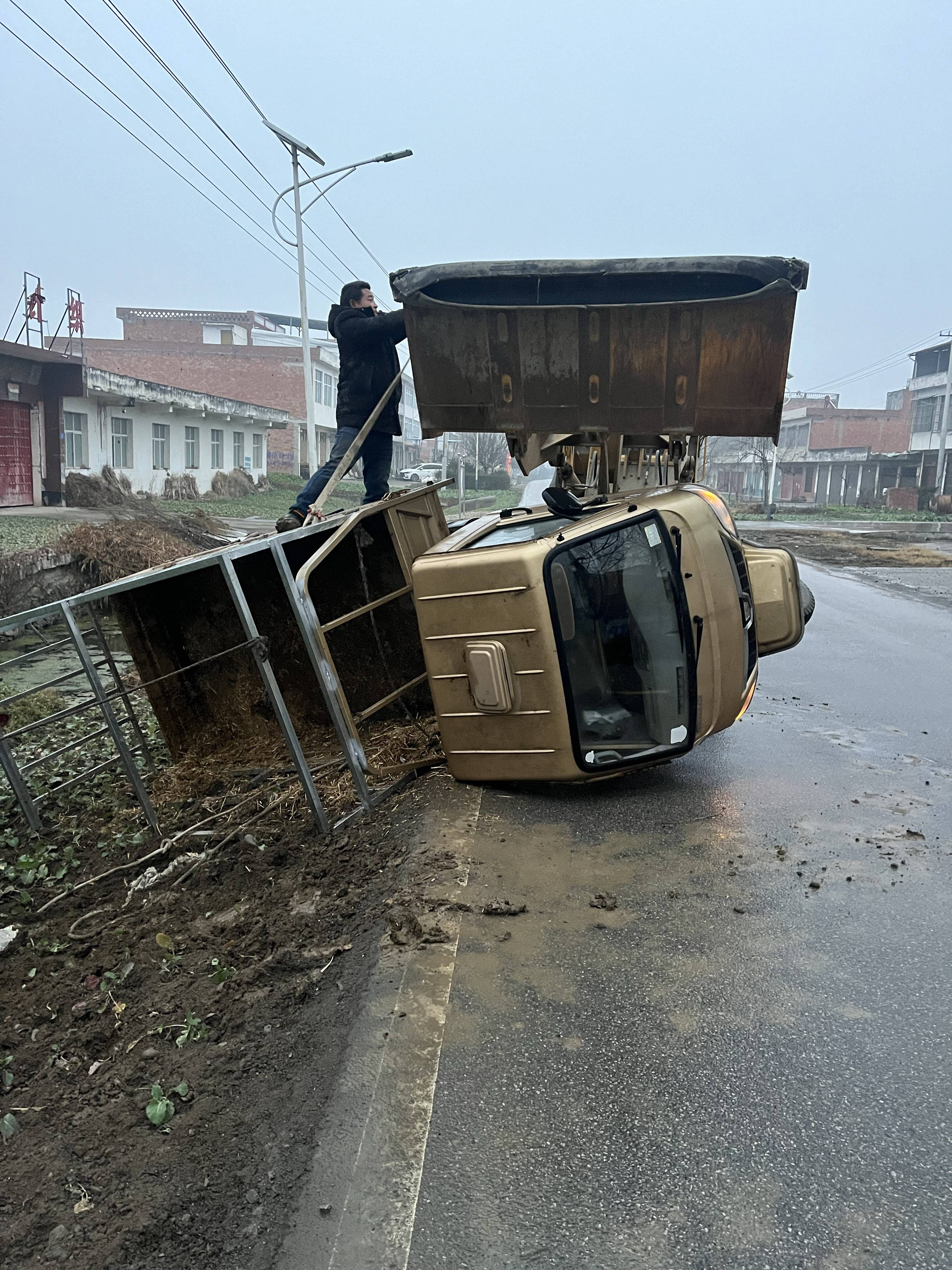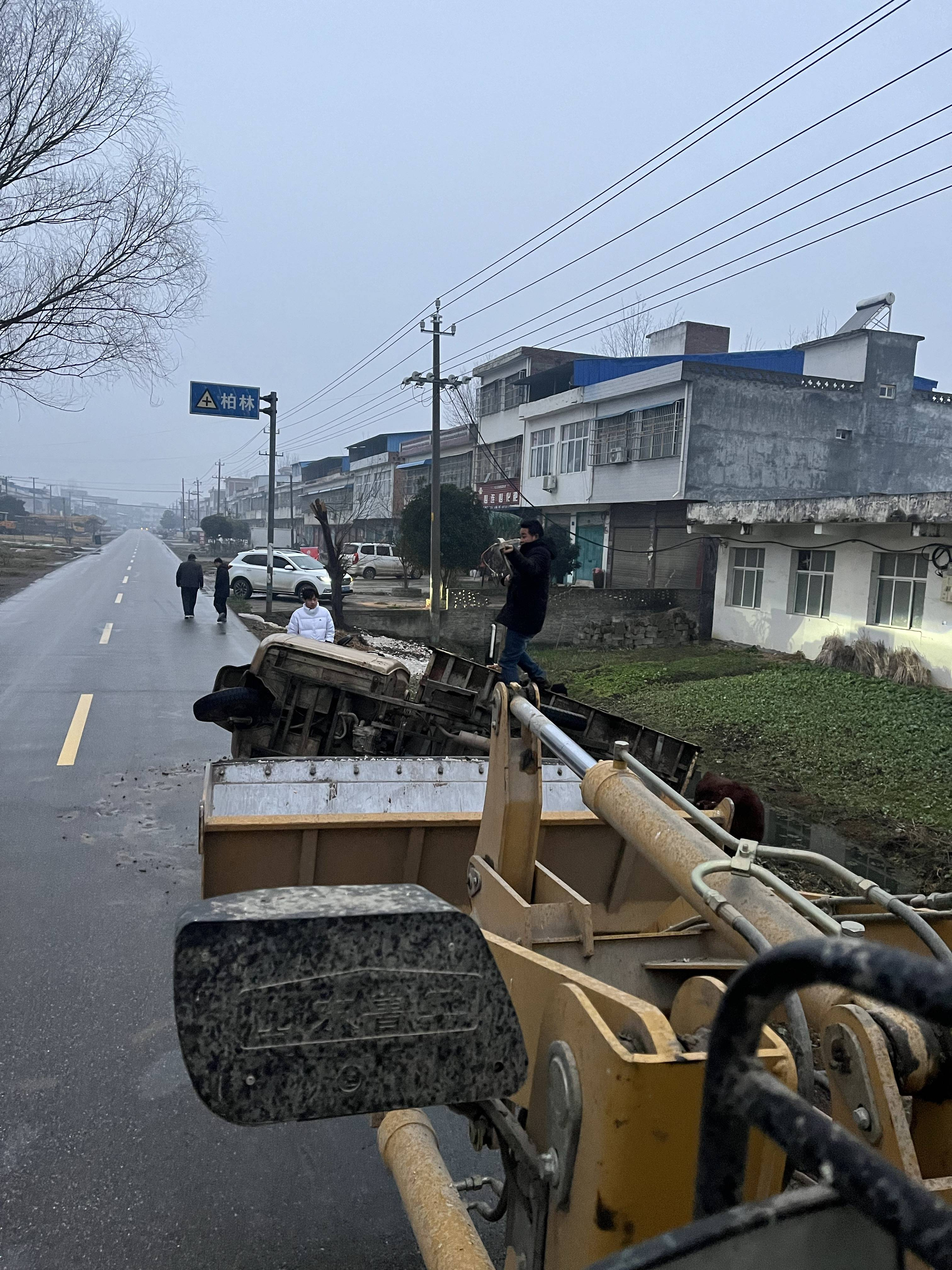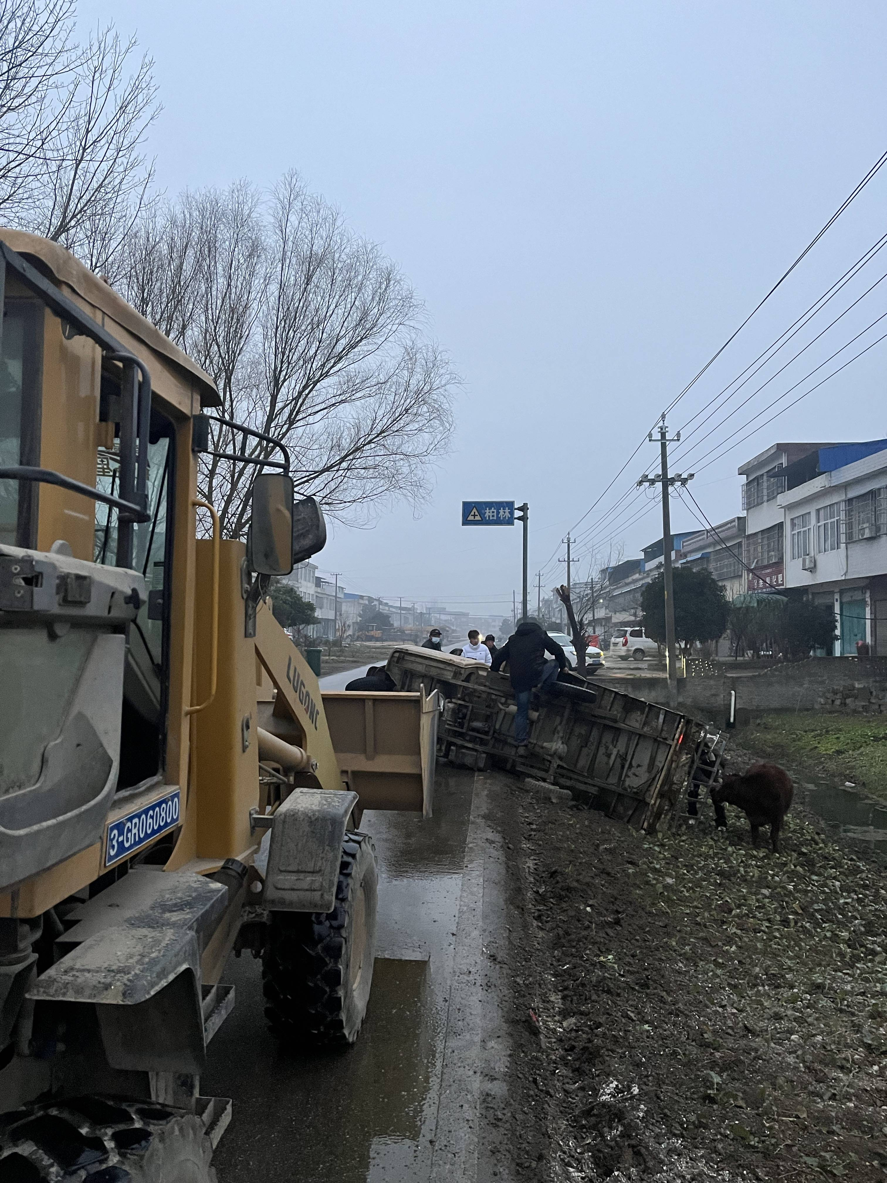 现场救援的视频显示,在一处行经柏林村的马路上,道路湿滑,一辆黄色的小型农用货车侧翻在水沟里,一辆铲车被绑上牵引绳,然后用翻斗一顿操作,将货车从岸边拉了起来。车上人员也成功被救出。