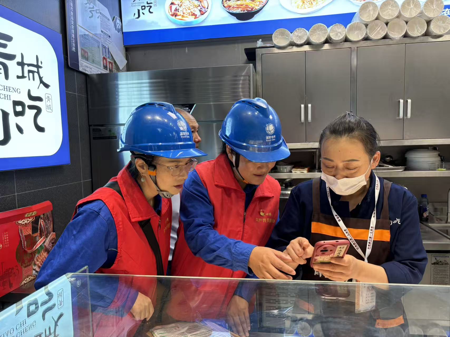 10月1日,国网四川电力(成都都江堰)连心桥共产党员服务队在青城山景区小吃店指导商户使用电力服务APP,保障国庆期间用电服务便捷高效。