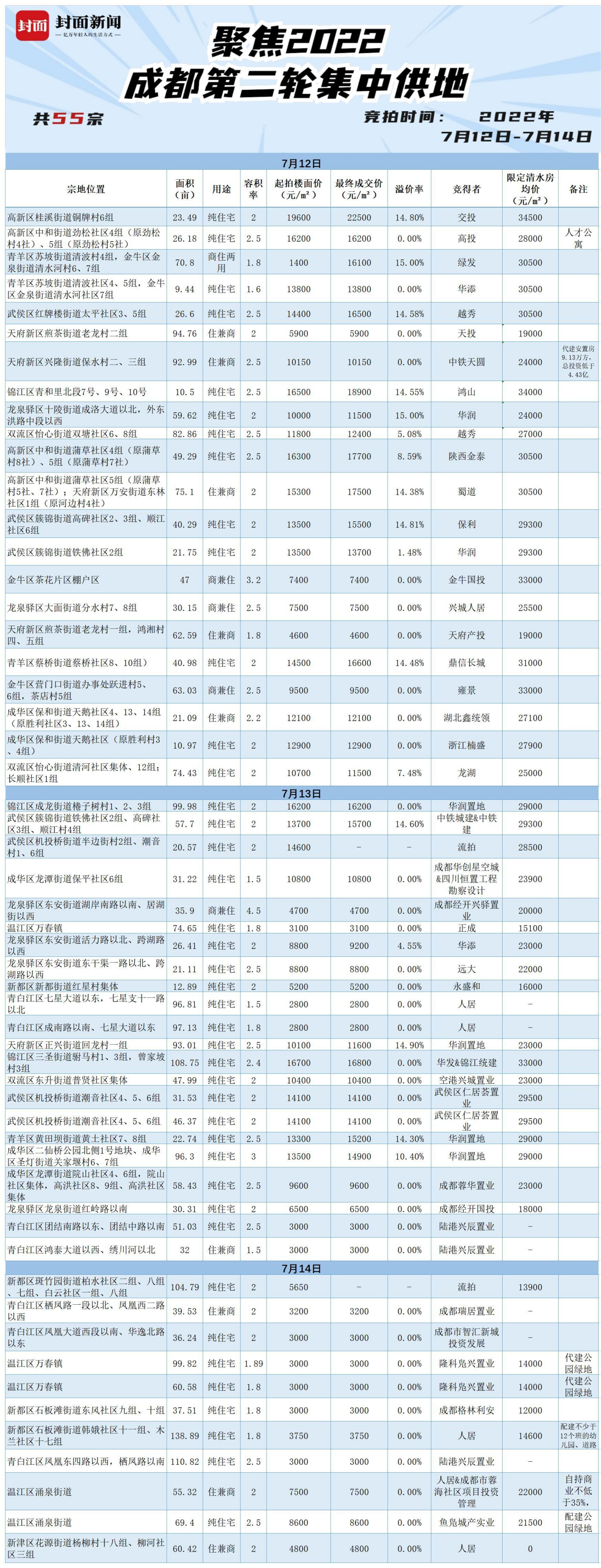 7月12日-7月14日,成都2022年二批次集中供地落下帷幕。本批次集中供应土地55宗,最终成交53宗、流拍2宗,整体溢价率5.25%,土地总成交面积约2914.73亩,土地出让金总额约402.4亿。成交地块中,35宗为底价成交,18宗溢价成交,其中11宗达到最高限价进入抽签环节。