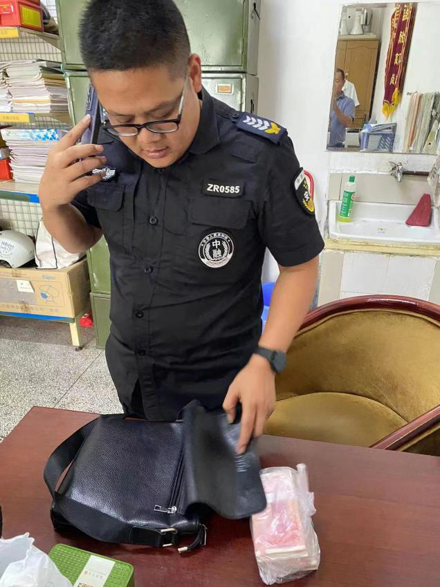 9月12日,四川省肿瘤医院安保队员黄鑫成在院区开展例行执勤巡逻时,在该院第三住院大楼一楼休息座位上发现一个破旧的皮包,便上前询问周边有没有物主,见无人回应便打开寻找有用的信息,仔细一看,却发现皮包内装了好几沓现金。