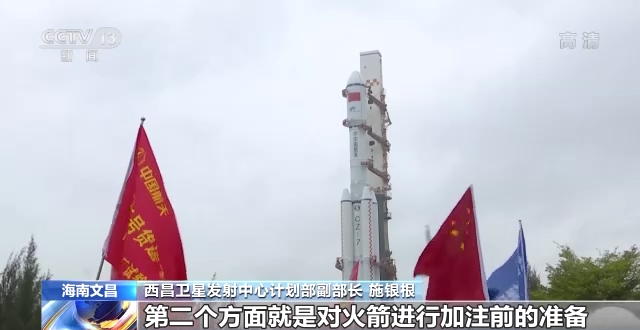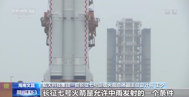 航天科技集团一院长征七号运载火箭总体副主任设计师 王夕:长征七号火箭在设计之初,就在设计上进行了一系列防水防潮的措施,在转场之前,我们也采取了防水防潮的处理。目前的天气来说,长征七号火箭是允许中雨发射的条件。