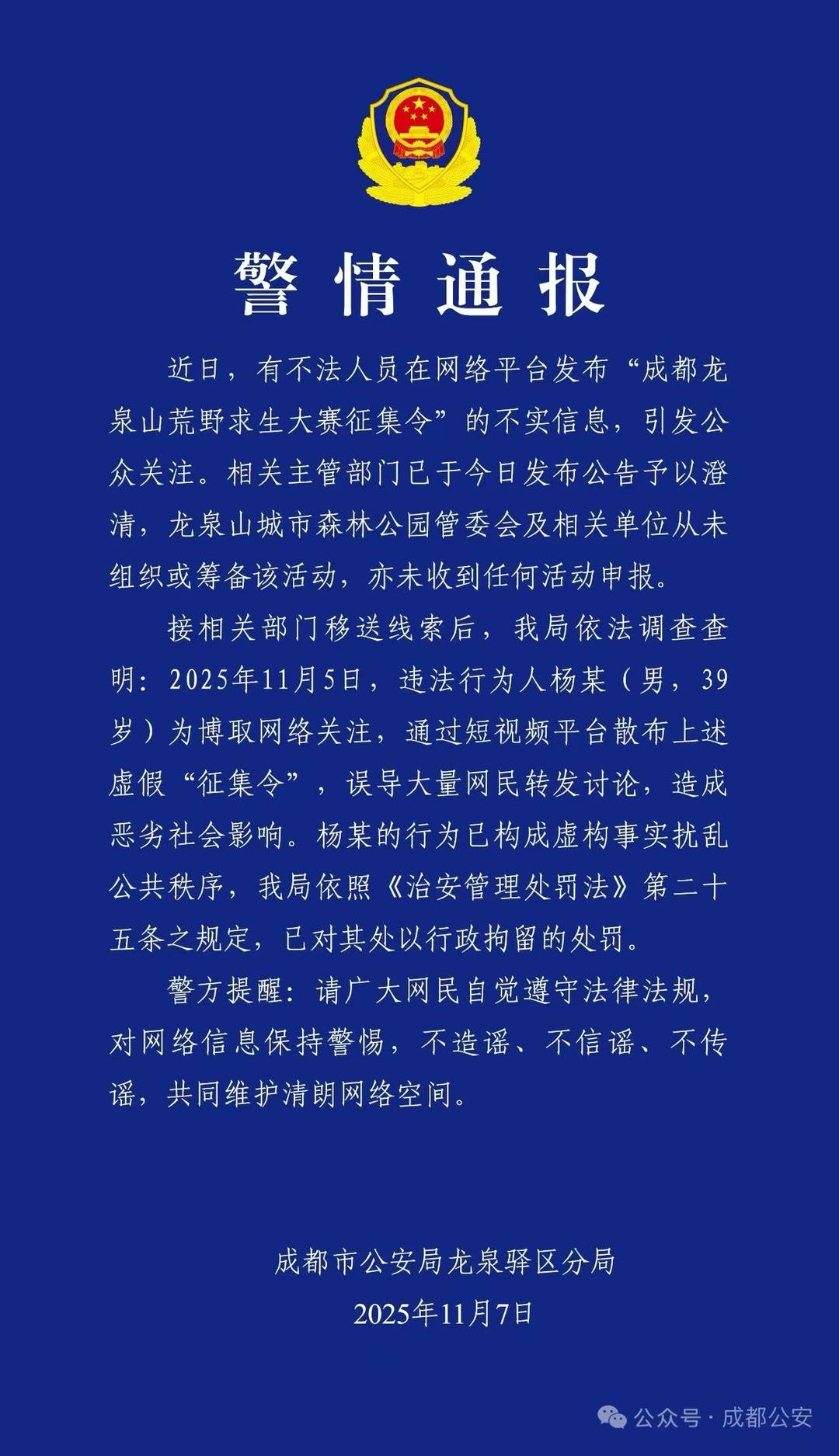 详情:11月7日,成都市公安局龙泉驿区分局针对近日“成都龙泉山荒野求生大赛征集令”一事发布警情通报: