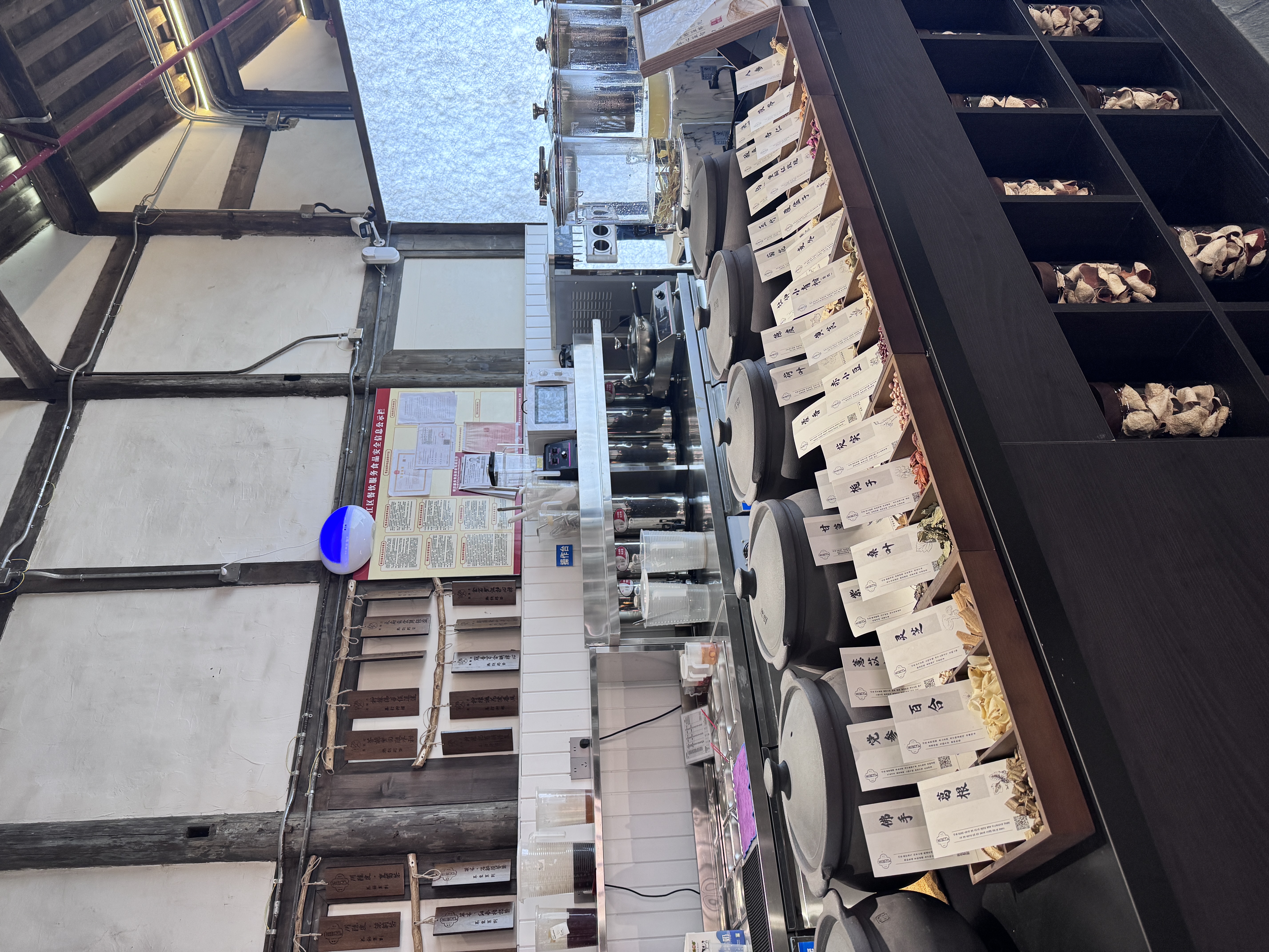走进店内,一面深木色的百子柜沿墙展开,格子里整齐陈列着金黄的佛手、饱满的参片。每个抽屉外都工整标注着药材名:陈皮、茯苓、枸杞……空气中萦绕着草木清香与淡淡甜韵。柜台旁,数个玻璃茶桶澄澈可见,盛放着当日萃取的药材原液,色泽从浅琥珀到深褐,兑现着“原料可见”的承诺。