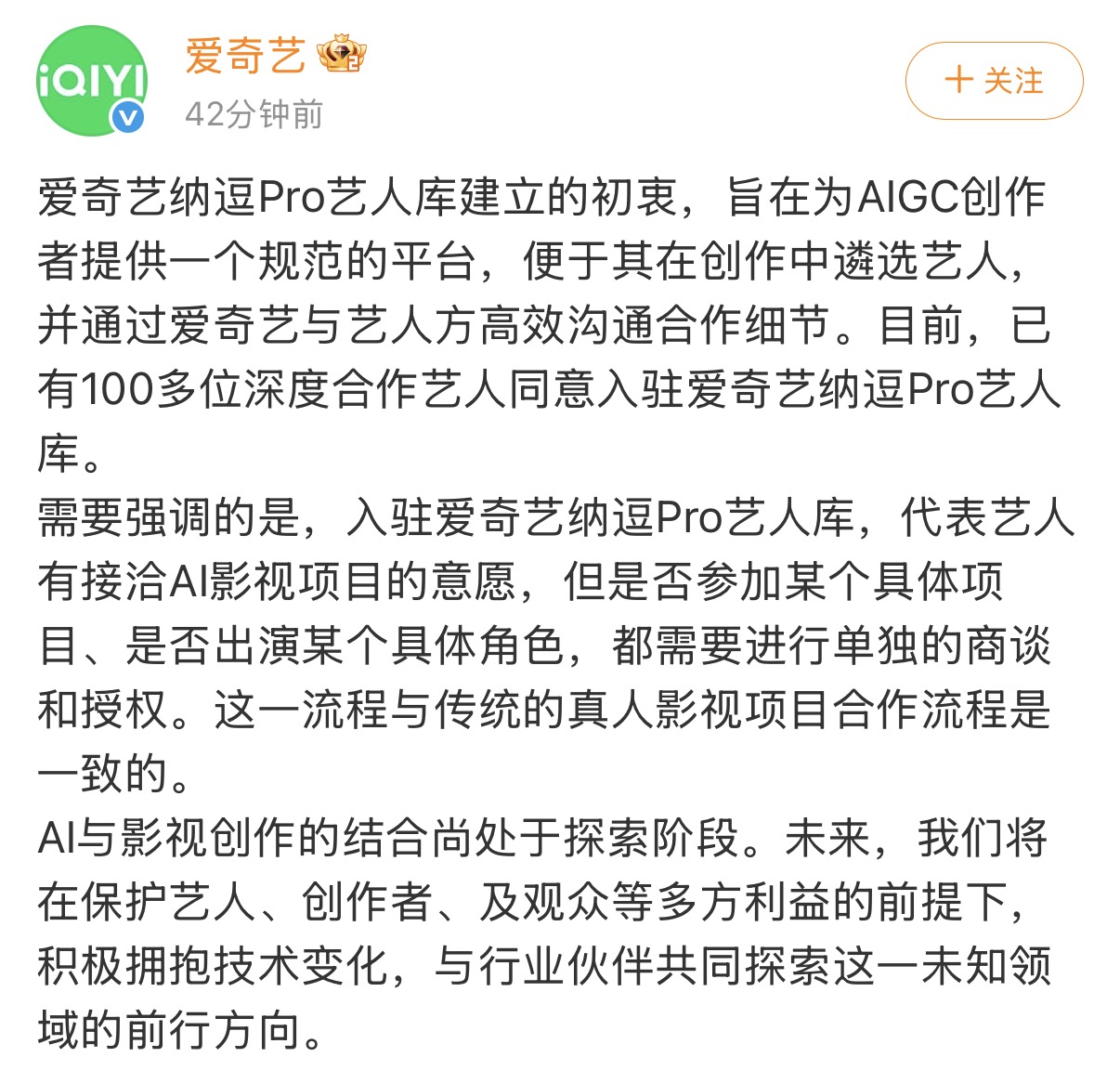 爱奇艺强调,“入驻爱奇艺纳逗Pro艺人库,代表艺人有接洽AI影视项目的意愿,但是否参加某个具体项目、是否出演某个具体角色,都需要进行单独的商谈和授权。这一流程与传统的真人影视项目合作流程是一致的。”