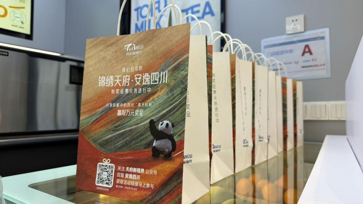 扫描袋身二维码关注“天府新视界”,回复“安逸四川”,获取活动链接,对应征集种类,上传你眼中的四川“高光时刻”,你的故事将和万千网友的创意一起,成为向世界讲述“安逸四川”的鲜活注脚,更有机会获得丰厚奖金:一等奖10件,每件奖励1万元;二等奖20件,每件奖励5000元;三等奖50件,每件奖励2000元;网络人气单项奖20件,每件奖励1000元。