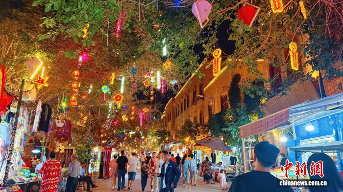 在喀什古城景区恰萨路,百余棵古树上挂着石榴籽、祥云造型的灯饰,悬吊的诗词歌赋牌透着书香气息,红灯笼在夜幕中尤为明亮……“我们在此搭建了扇拱形门,上面的回形纹是中原建筑特色,而门后的土陶作坊,传承了维吾尔族模制法土陶烧制技艺……”在阿丽亚的精彩讲述中,游客感受着建筑装饰里的“文化交融密码”。