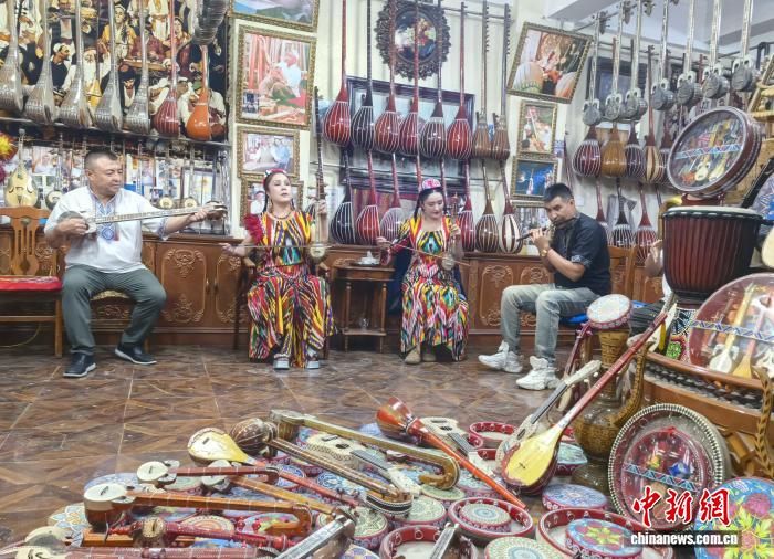新疆喀什古城居民弹奏乐器。胡嘉琛 摄