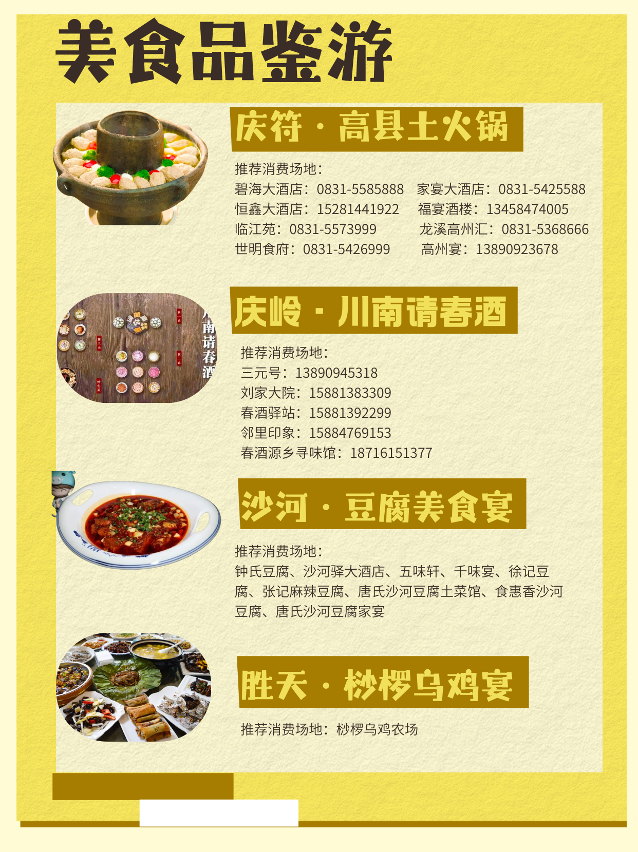 2.美食品鉴游(路线:庆符·土火锅→ 庆岭·请春酒→ 沙河·豆腐宴→ 胜天·桫椤乌鸡宴)聚焦高县地道风味和四大特色美食,从非遗民俗宴席到乡土原生态珍馐,每一道菜品都凝聚着高县的山水灵气与人文积淀,让游客以味蕾为向导,一口尝尽川南烟火,解锁高县独有的舌尖盛宴。