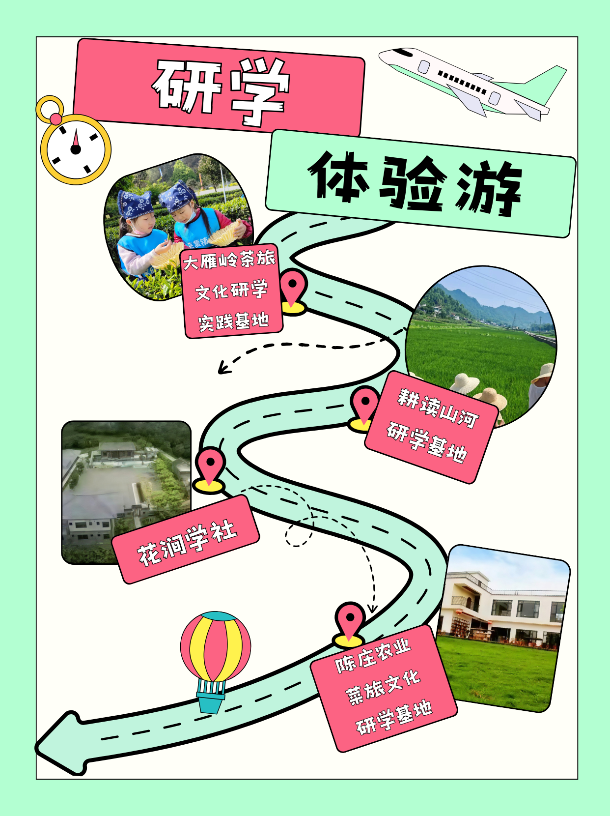 5.研学体验游(路线:大雁岭茶旅研学 → 耕读山河研学 →花涧学社→陈庄农业研学)聚焦实践与成长,整合各类优质研学资源,通过采茶制茶、下田农耕、非遗体验等沉浸式实践活动,让青少年与游客亲身感受川南特色茶文化与传统农耕智慧,在动手实践中增长见识、体悟自然,打造寓教于游的特色研学之旅。