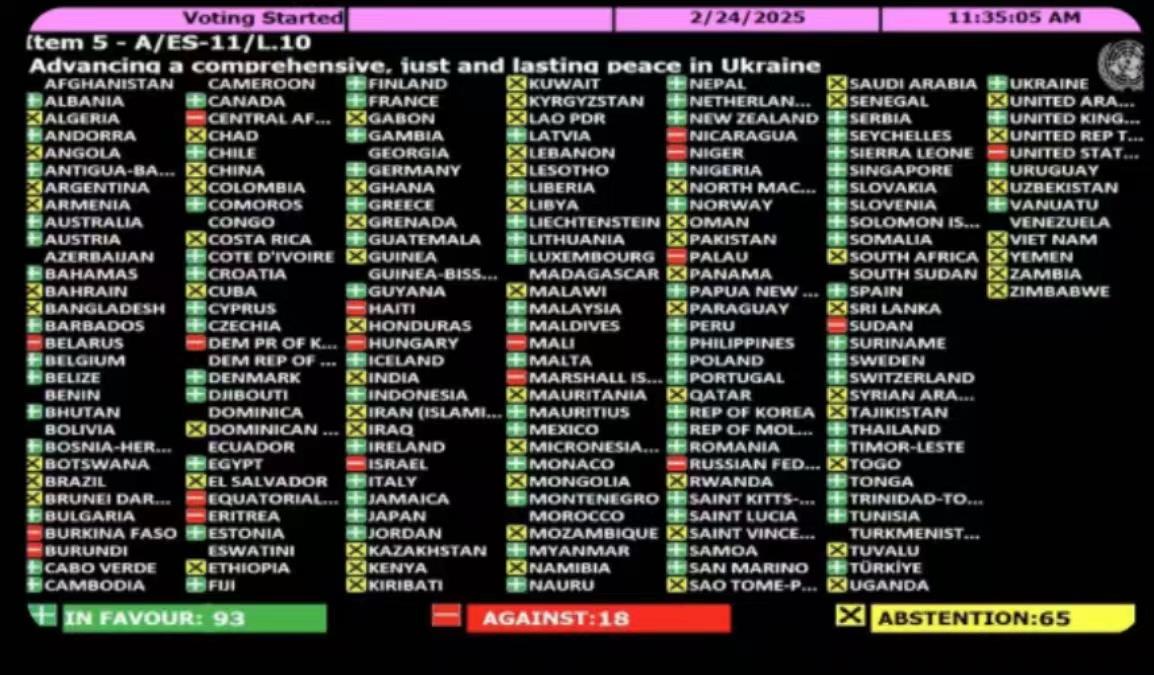 联大乌克兰问题紧急特别会议首先通过一项不具约束力的决议,呼吁俄罗斯结束在乌克兰的“敌对行动”,重申迫切需要在今年结束冲突。这份由乌克兰提出的、获欧洲多国支持的决议草案以93票赞成、18票反对、65票弃权的结果获得通过。值得注意的是,美国和俄罗斯都投出了反对票。