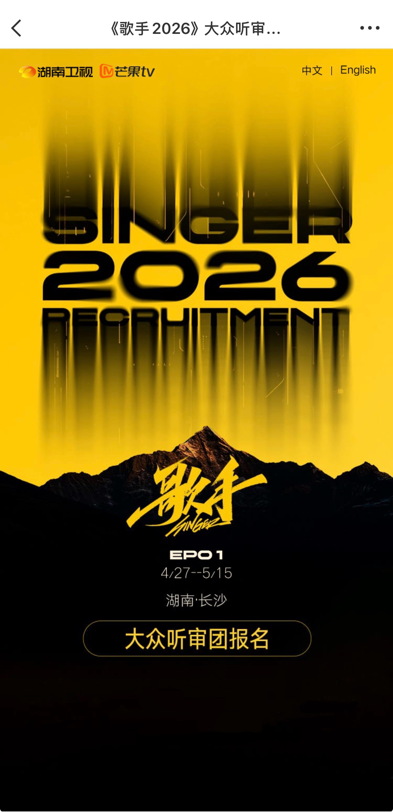 封面新闻记者扫码进入大众评审报名页,首页就显示“EP01 4/27-5/15”字样,由此可以推测,首期节目大众评审报名从4月27日开始,或将于5月15日结束,节目录制或将在5月中下旬。此前,也有知情人告诉封面新闻记者,《歌手2026》首期录制得到“5月中下旬”。