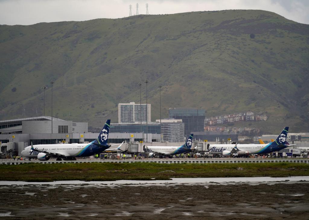 这是2024年4月4日在美国旧金山国际机场拍摄的阿拉斯加航空公司飞机。阿拉斯加航空公司当日表示,波音公司在今年第一季度向其支付了约1.6亿美元,以赔偿“掉门”事故和737 MAX 9飞机停飞对这家航空公司造成的损失。新华社发(李建国摄)