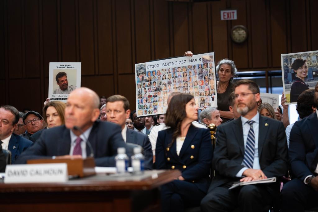 2024年6月18日,在美国华盛顿,人们在波音CEO戴夫·卡尔霍恩出席国会听证会期间举牌抗议。新华社记者刘杰摄