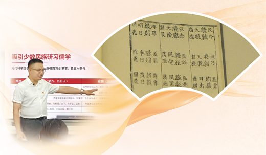 左图:邓文韬在授课。 本报记者 张 文摄 右图:《番汉合时掌中珠》内页。 尤亚辉摄(影像中国) 制图:汪哲平