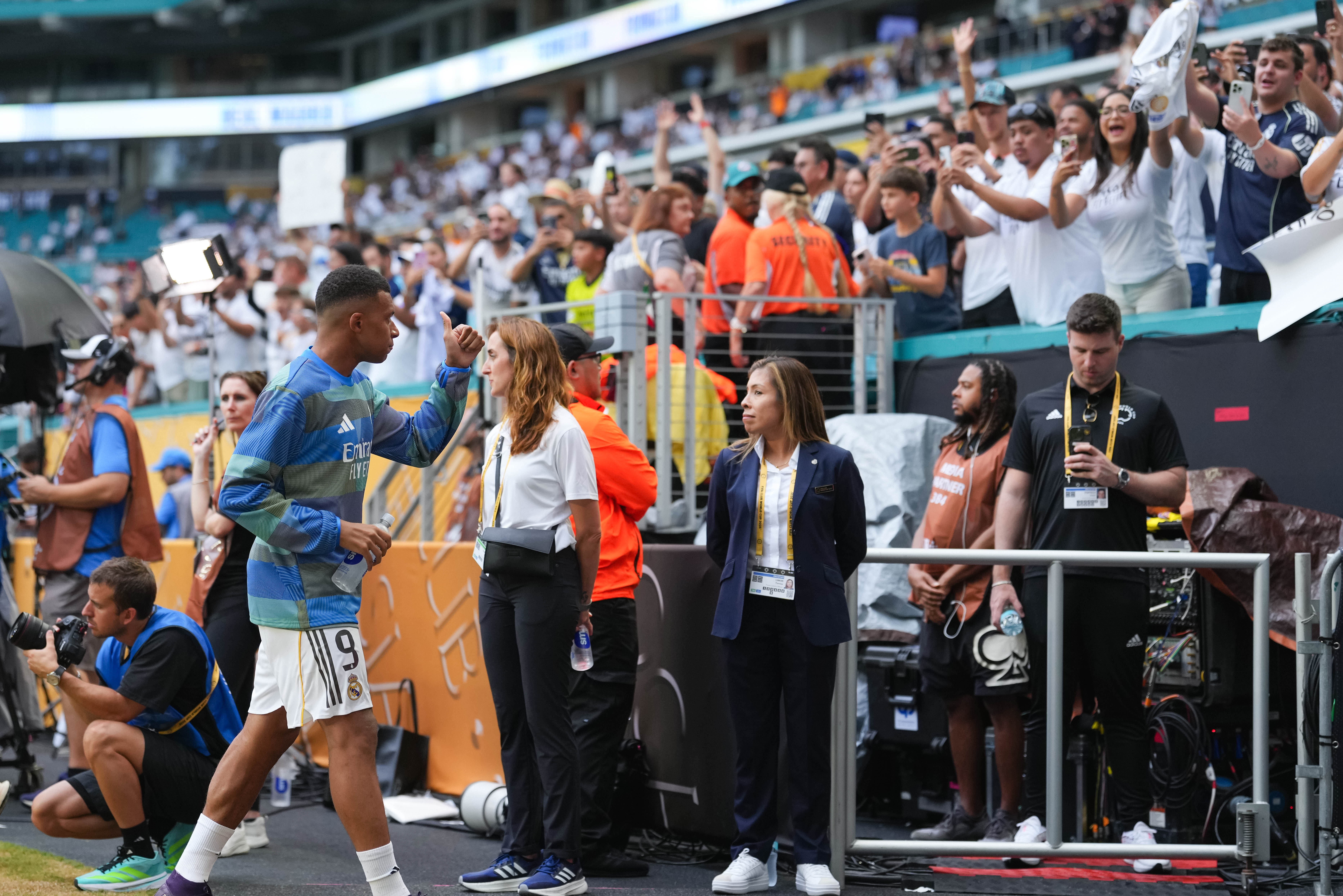 7月1日,皇家马德里队球员姆巴佩在比赛前向球迷致意。新华社记者 许畅 摄