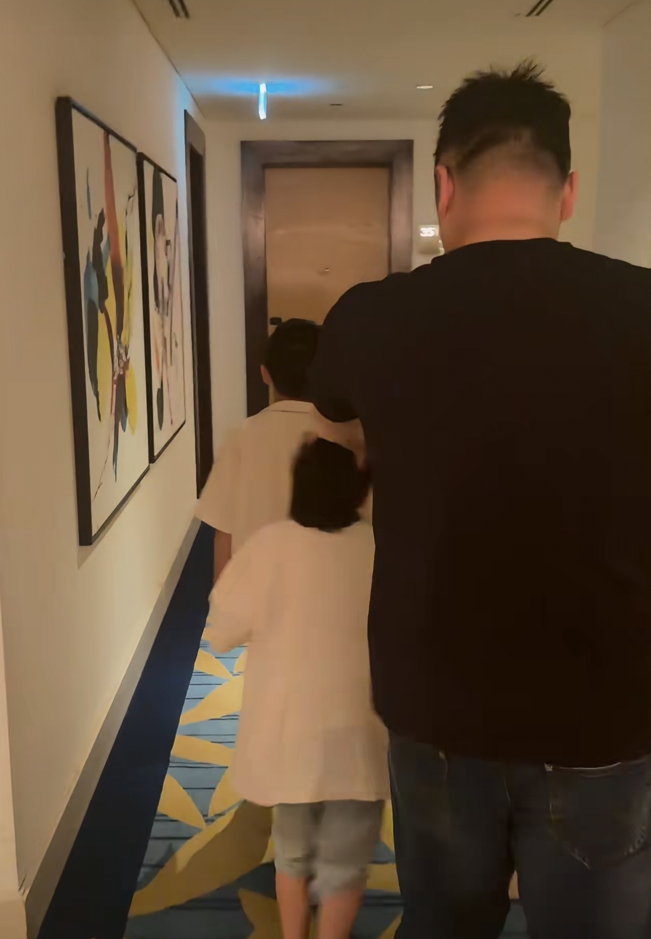滞留迪拜的李女士一家人准备从酒店下楼觅食。社交平台视频截图