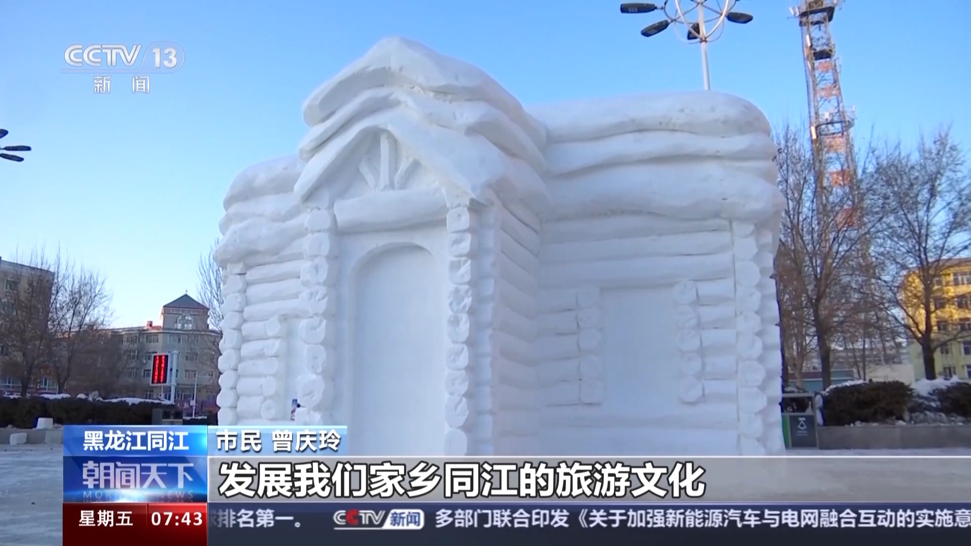 市民 曾庆玲:非常壮观,也希望我们同江也能多多建造一些比较壮观、有吸引力的雪雕、冰雕,也能吸引更多的中外游客,发展我们家乡同江的旅游文化。