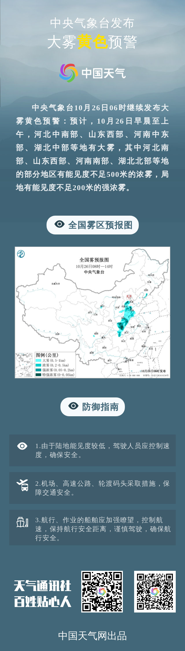 中央气象台10月26日06时继续发布大雾黄色预警:预计,10月26日早晨至上午,河北中南部、山东西部、河南中东部、湖北中部等地有大雾,其中河北南部、山东西部、河南南部、湖北北部等地的部分地区有能见度不足500米的浓雾,局地有能见度不足200米的强浓雾。