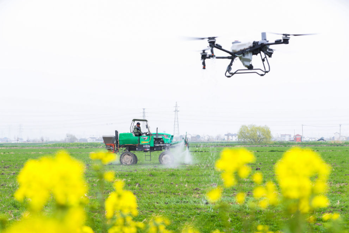 3月13日,在江苏省兴化市陈堡镇蒋庄村,农民驾驶植保无人机、自走式喷杆喷雾机实施杂草防治作业。新华社发
