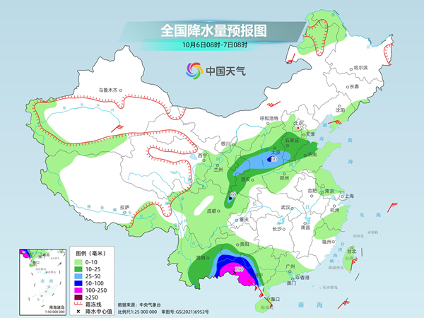 具体来看,中央气象台预计,今天,西北地区东部、华北中西部和南部、黄淮东部、四川盆地北部、华南南部和海南岛等地部分地区有大到暴雨,其中,广西南部、广东西南部、海南岛大部等地部分地区有大暴雨,广西东南部沿海、广东西南部沿海、海南岛北部等地局地特大暴雨(250~320毫米)。