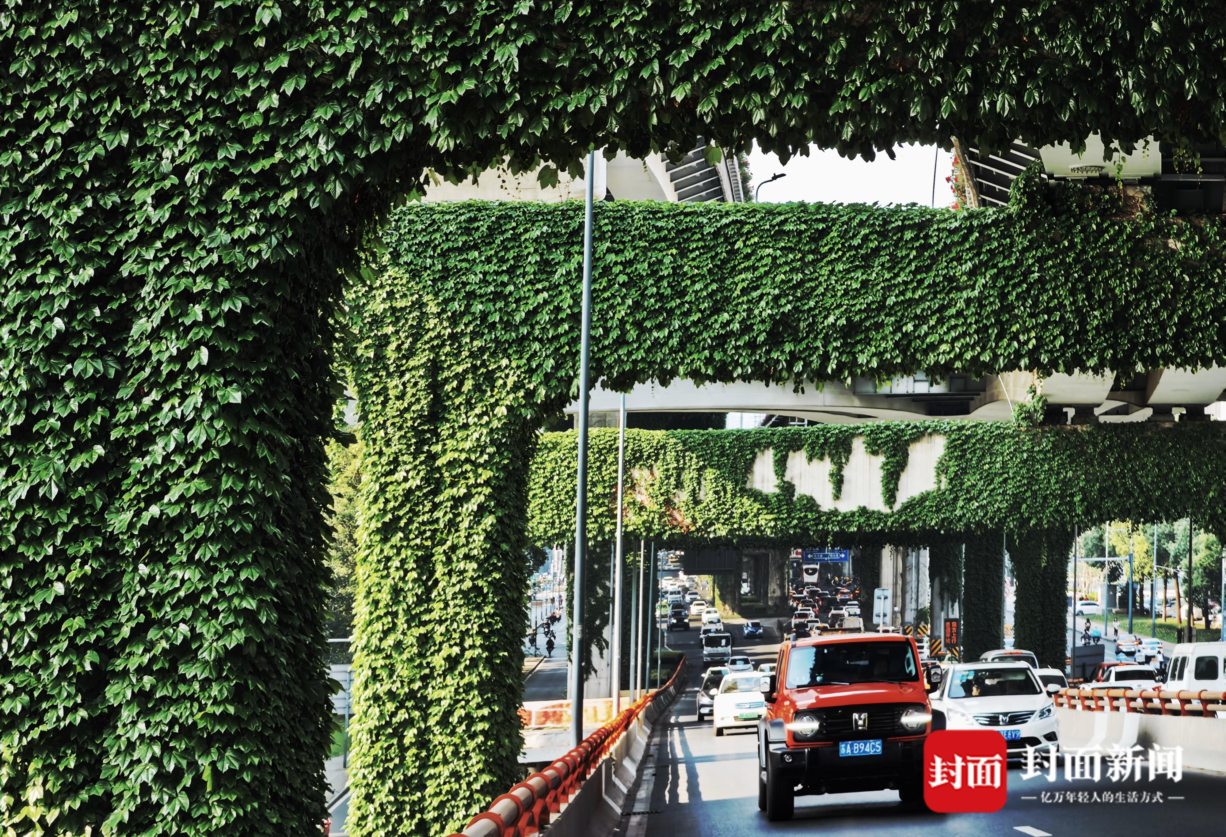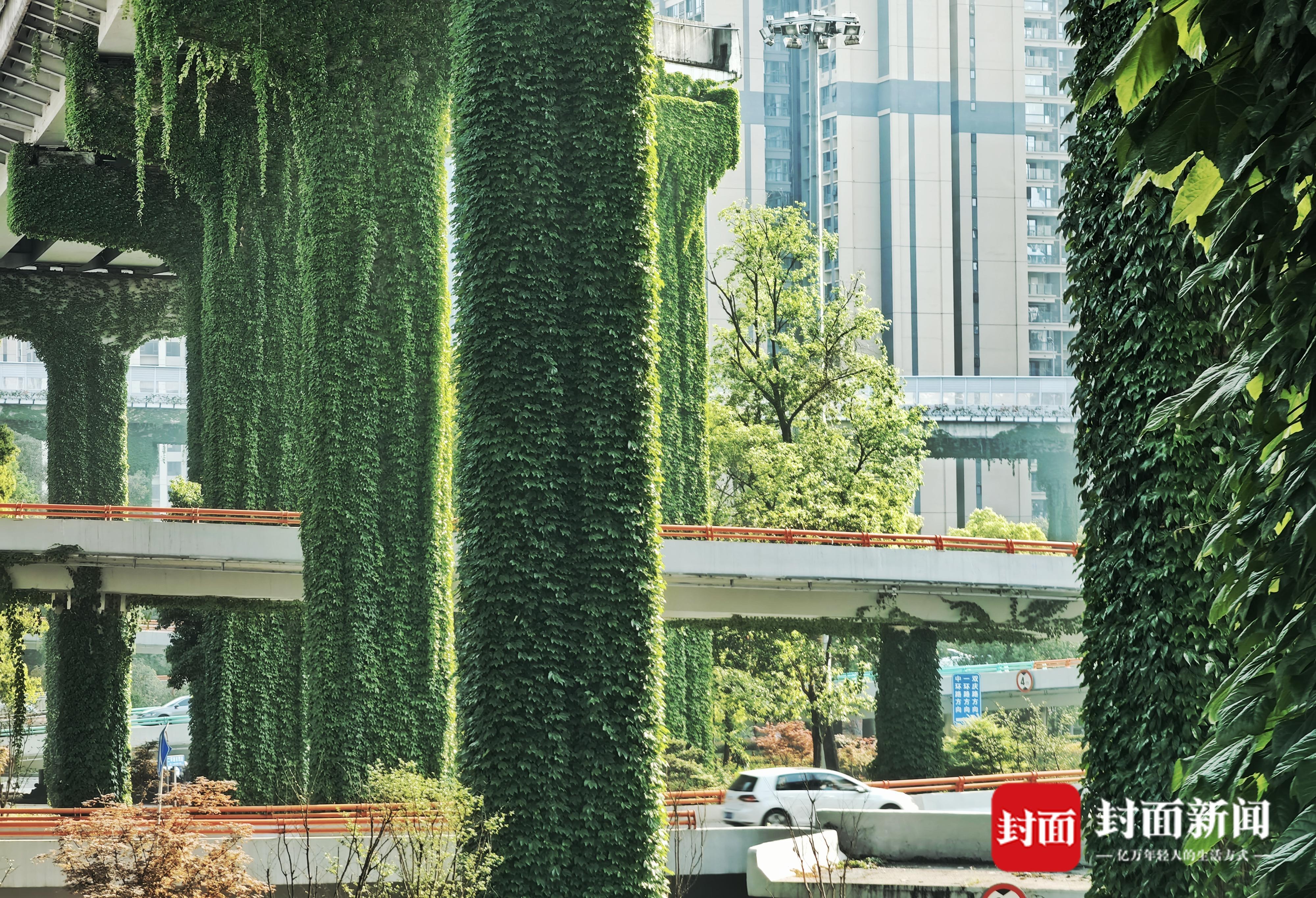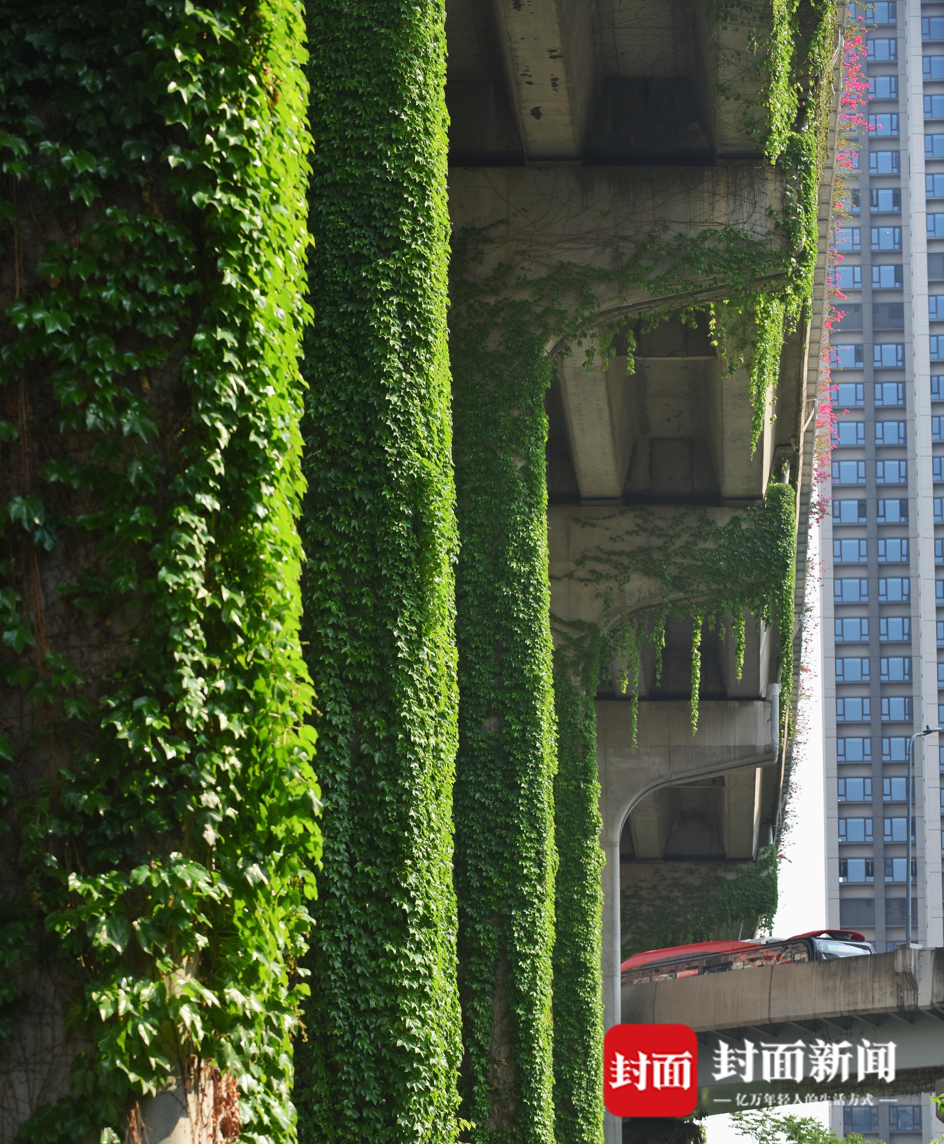 4月19日,春天的四月草木皆绿,攀爬在成都二环路高架桥上的爬山虎,也在钢筋混凝土的丛林里重新焕发生机,绿叶随风飞舞。成都二环高架又披上绿装,灰色的水泥桥梁被绿色包裹,远远望去就像绿色的绒毯一样。繁忙的车流在绿色丛中穿行,好像在穿越绿色隧道。