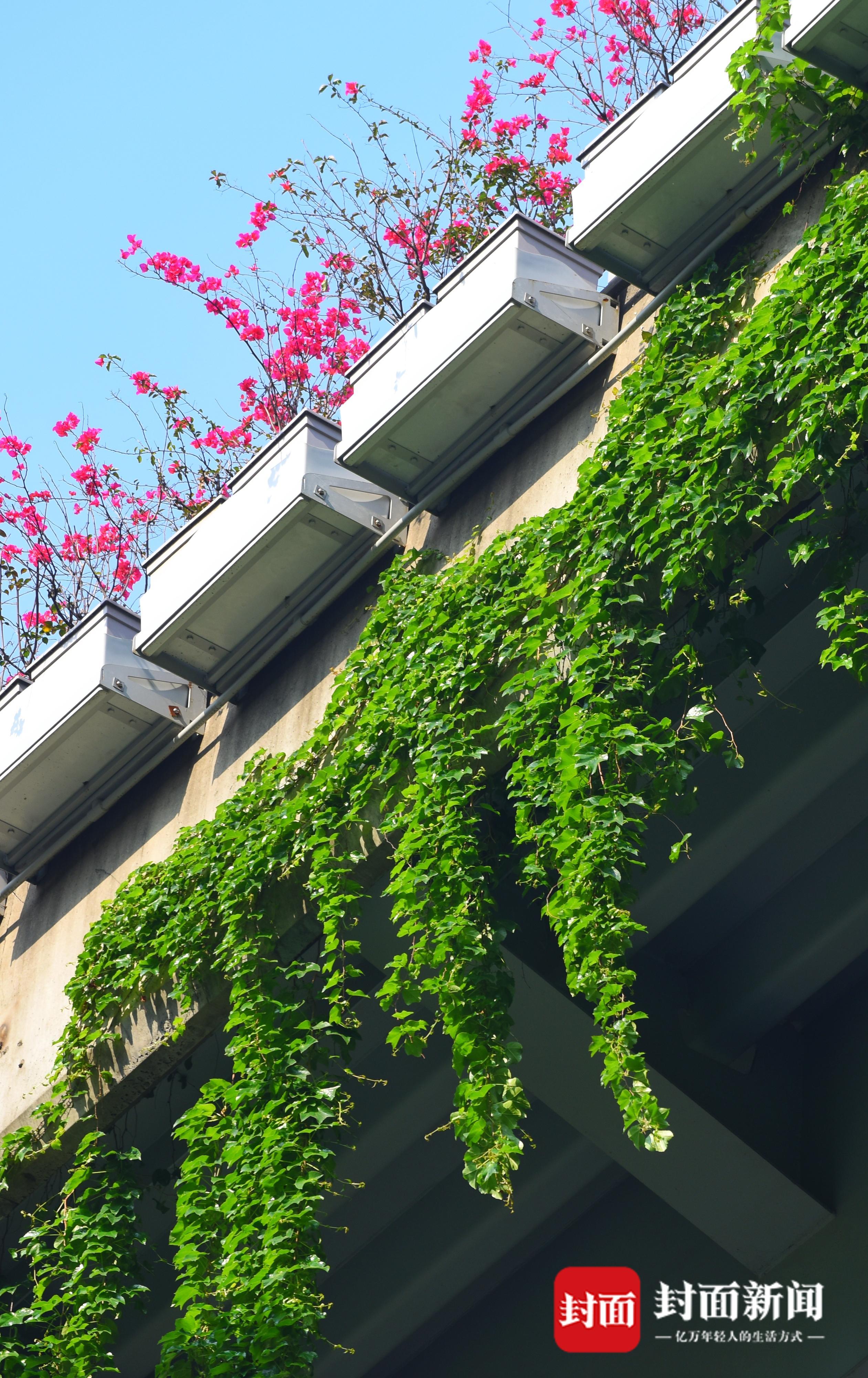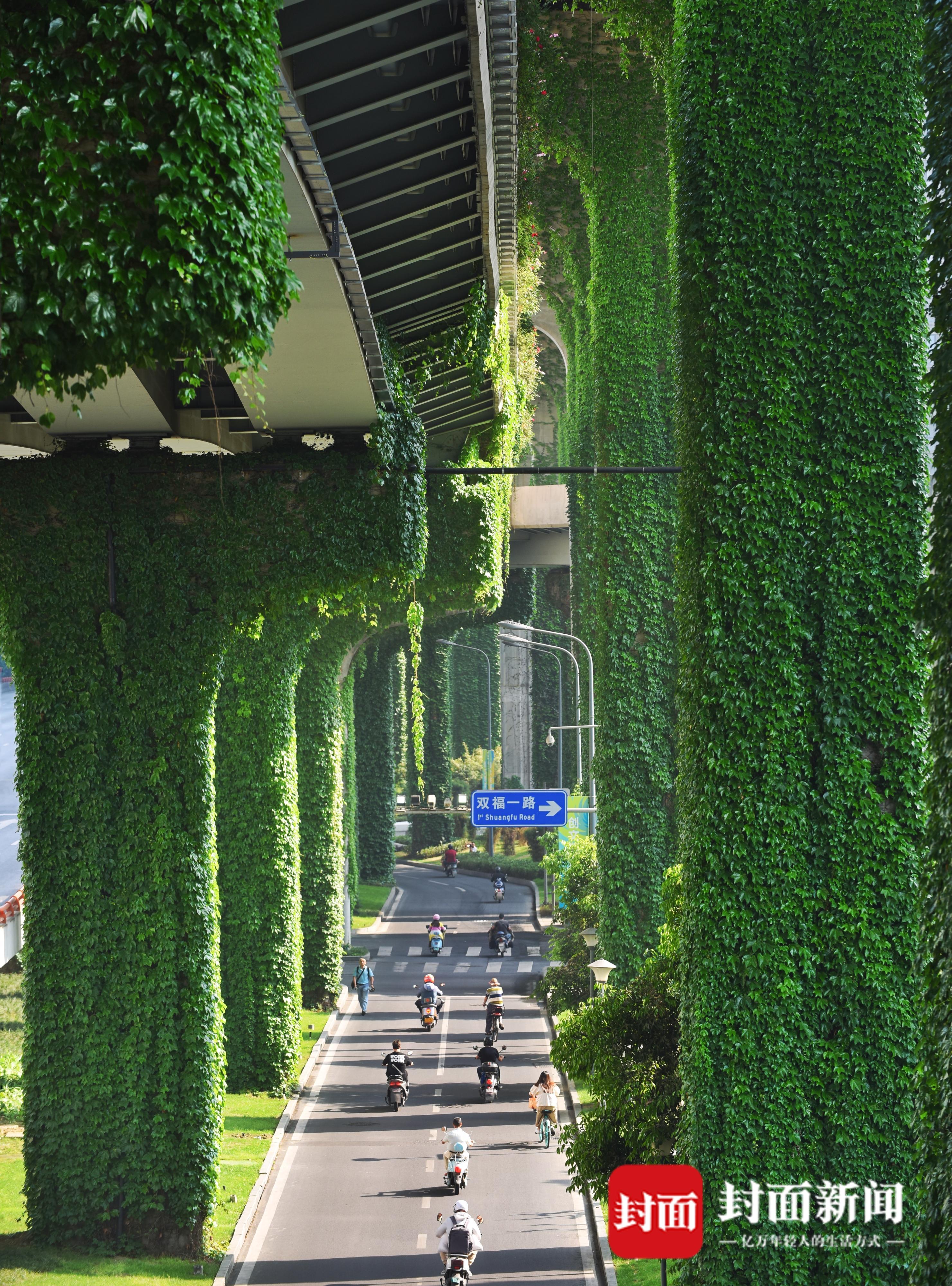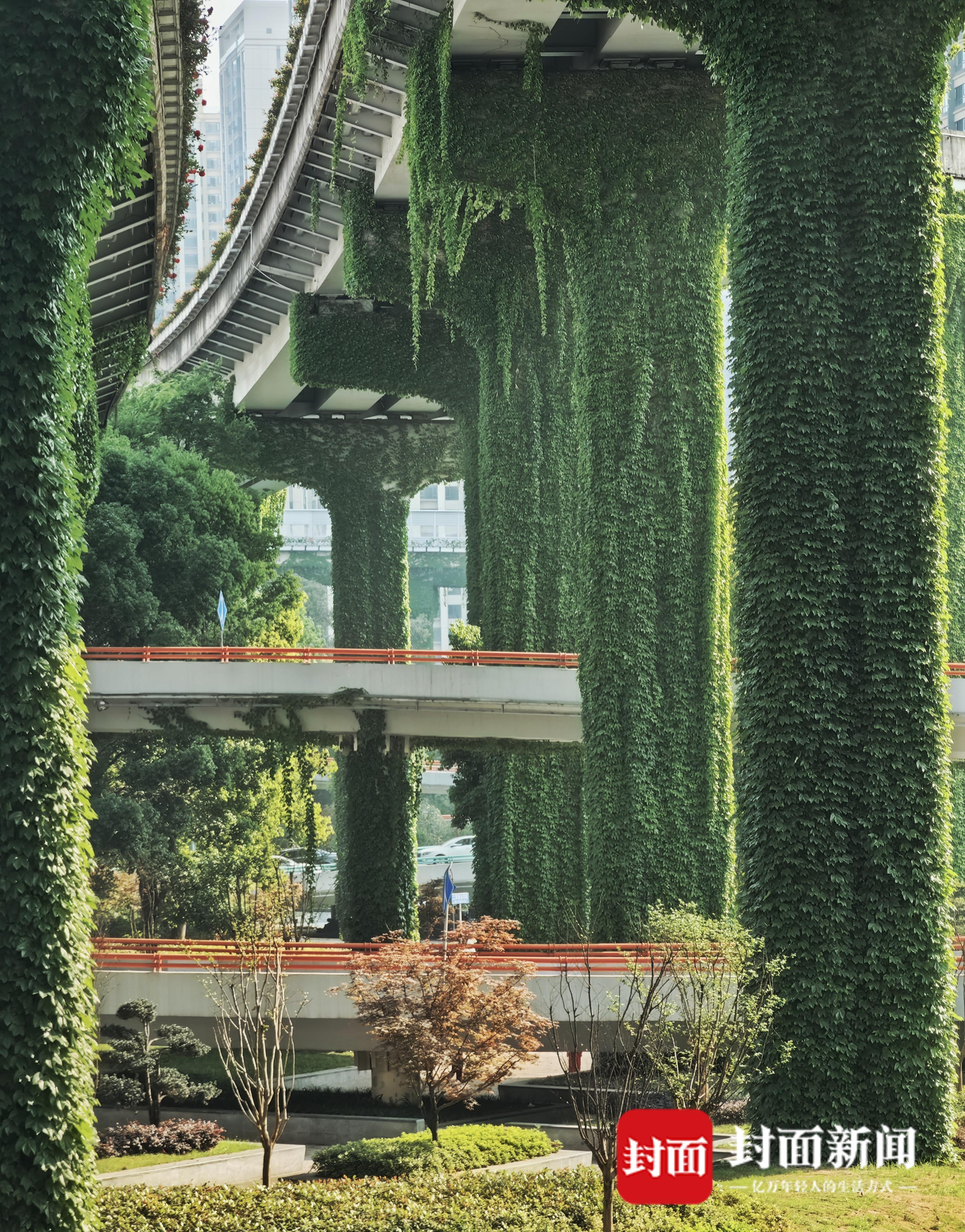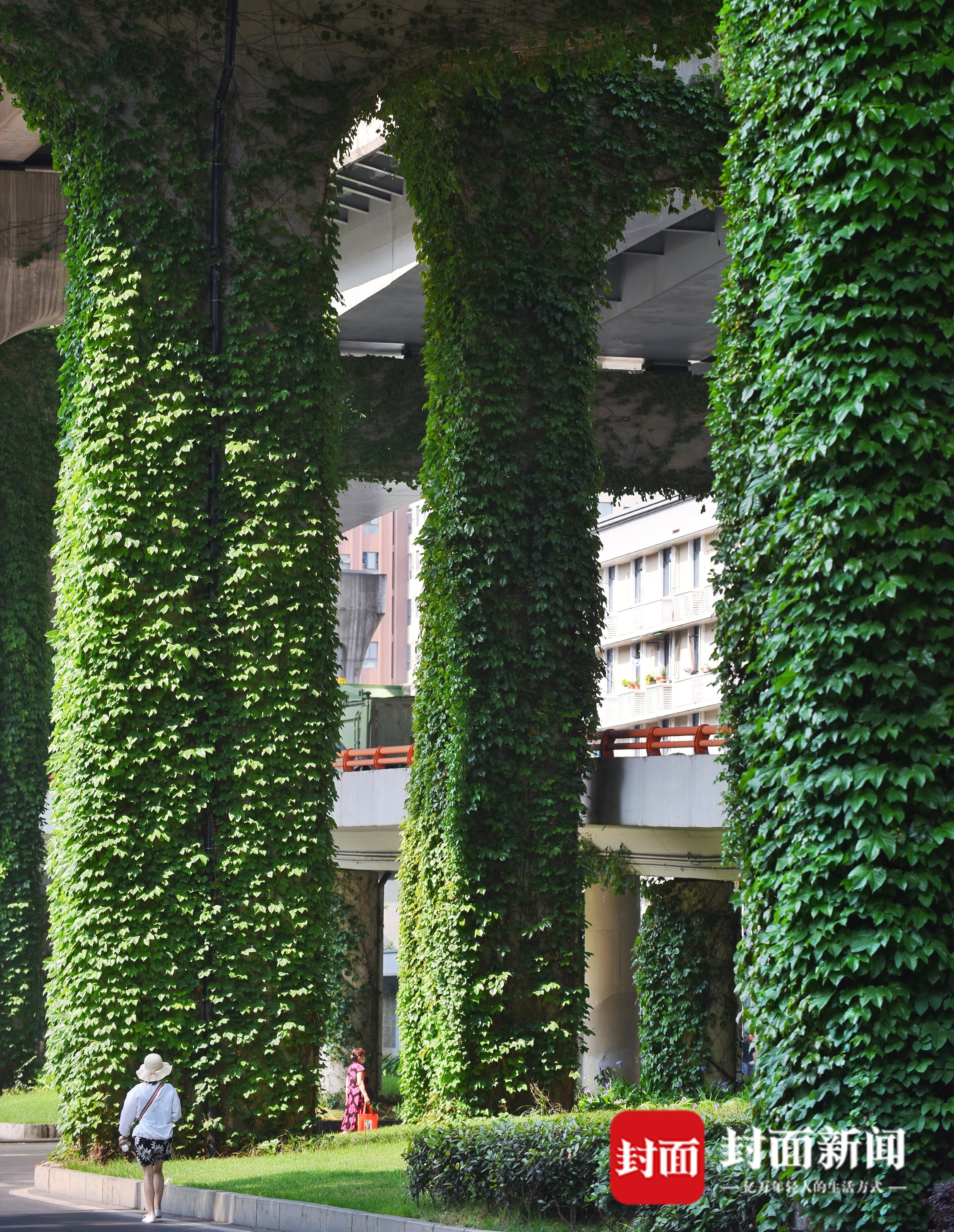 4月19日,春天的四月草木皆绿,攀爬在成都二环路高架桥上的爬山虎,也在钢筋混凝土的丛林里重新焕发生机,绿叶随风飞舞。成都二环高架又披上绿装,灰色的水泥桥梁被绿色包裹,远远望去就像绿色的绒毯一样。繁忙的车流在绿色丛中穿行,好像在穿越绿色隧道。