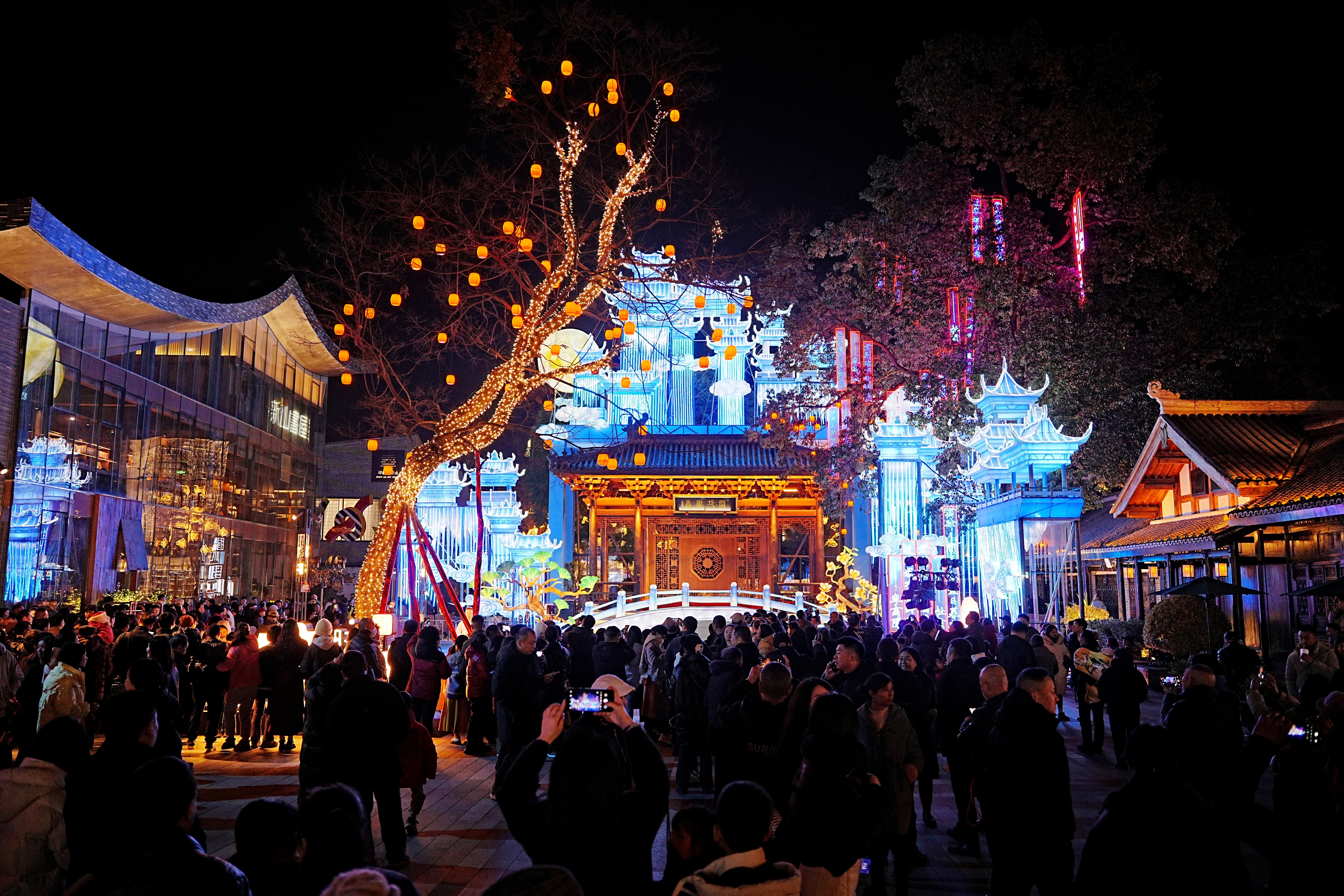 临邛古城张灯结彩,火树银花不夜天。琼楼玉宇,雕梁画栋,小桥流水,凤栖临邛……春节期间的临邛古城,满城光彩映古今,万盏华灯如真似梦。2025临邛古城灯会已在大北街-兴贤街拉开序幕。在点点繁灯的映照下,临邛古城传统与潮流融合共生的独特魅力展露无遗。行于其间,可以欣赏到近百组造型各异、创意迭出的花灯——有傲然独立的展翅火凤,有乖萌可爱的贺岁蛇宝,有穿越古今的“时光隧道”,亦有国风浓浓的花开富贵和锦城春色……
