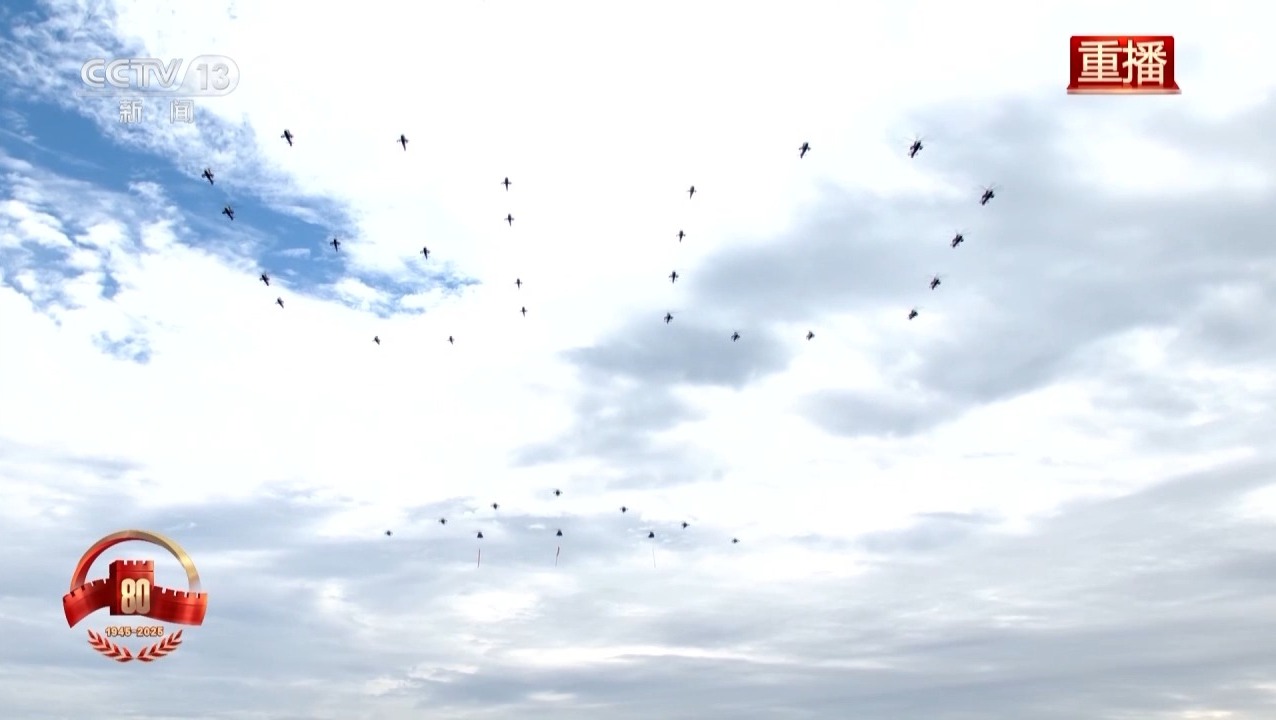 9时44分,空中护旗梯队率先亮相,揭开阅兵分列式的序幕——3架直升机分别悬挂中国共产党党旗、中华人民共和国国旗、中国人民解放军军旗迎风向前,26架直升机组成巨大的“80”字样,3架直升机分别悬挂“正义必胜”“和平必胜”“人民必胜”条幅飞过天安门广场。