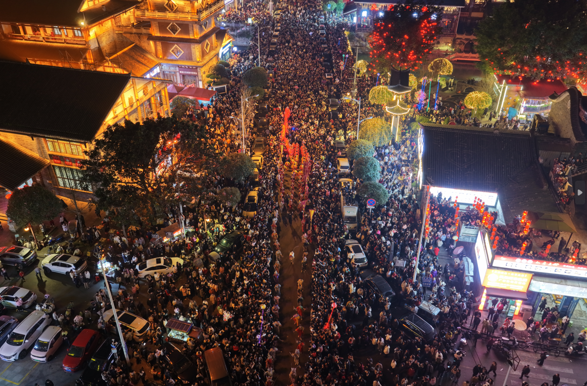2月18日,大年初二晚七点三十八分,四川宜宾南溪古街灯火璀璨、人声鼎沸。伴随着激昂的鼓点与铿锵的锣声,源自潮汕地区的英歌舞巡游在这里上演。专业英歌队与本地舞蹈团联袂登场,为现场市民和游客带来了一场跨越地域的文化视觉盛宴,在家门口营造出欢天喜地过新年的浓厚氛围。