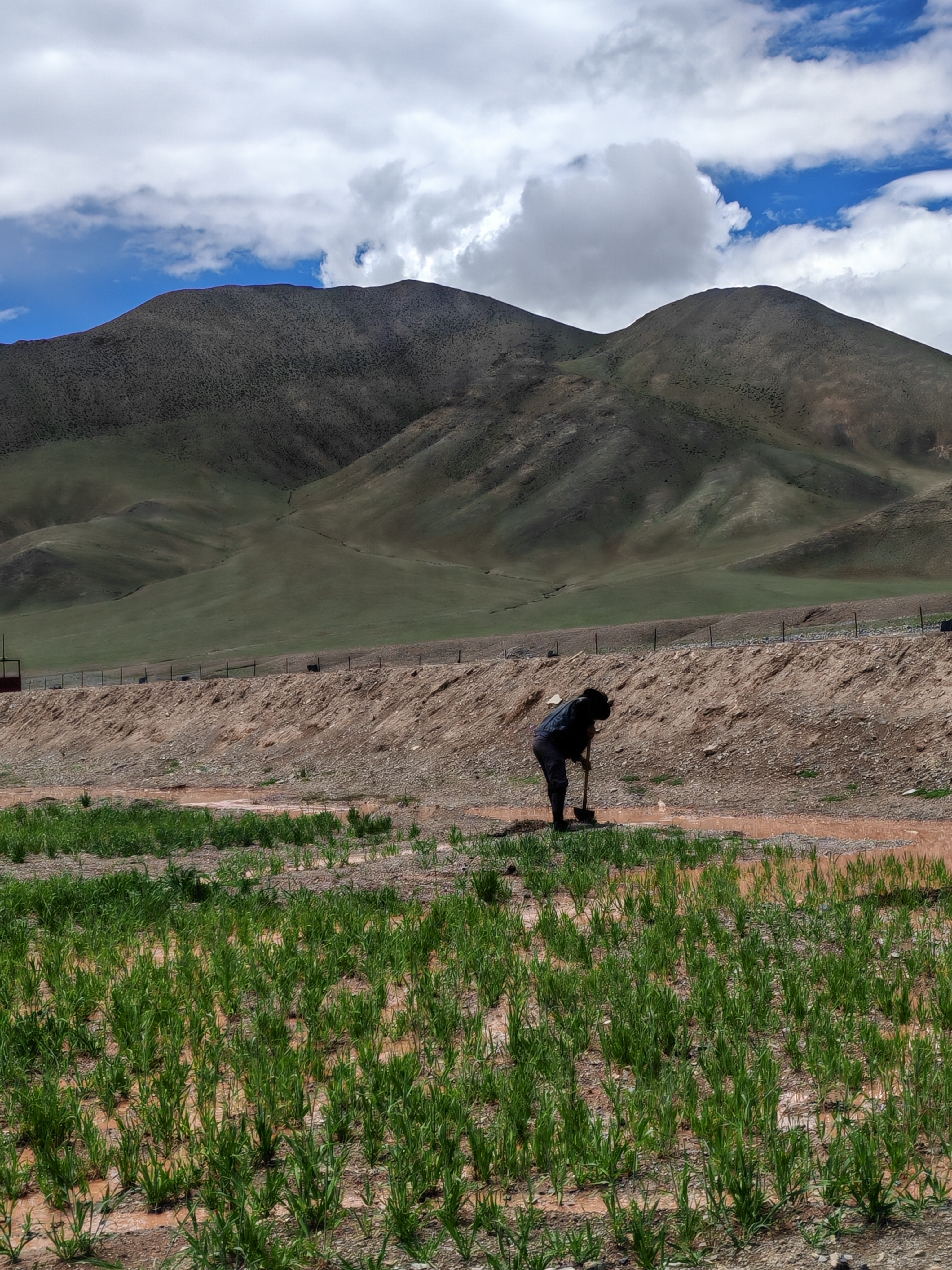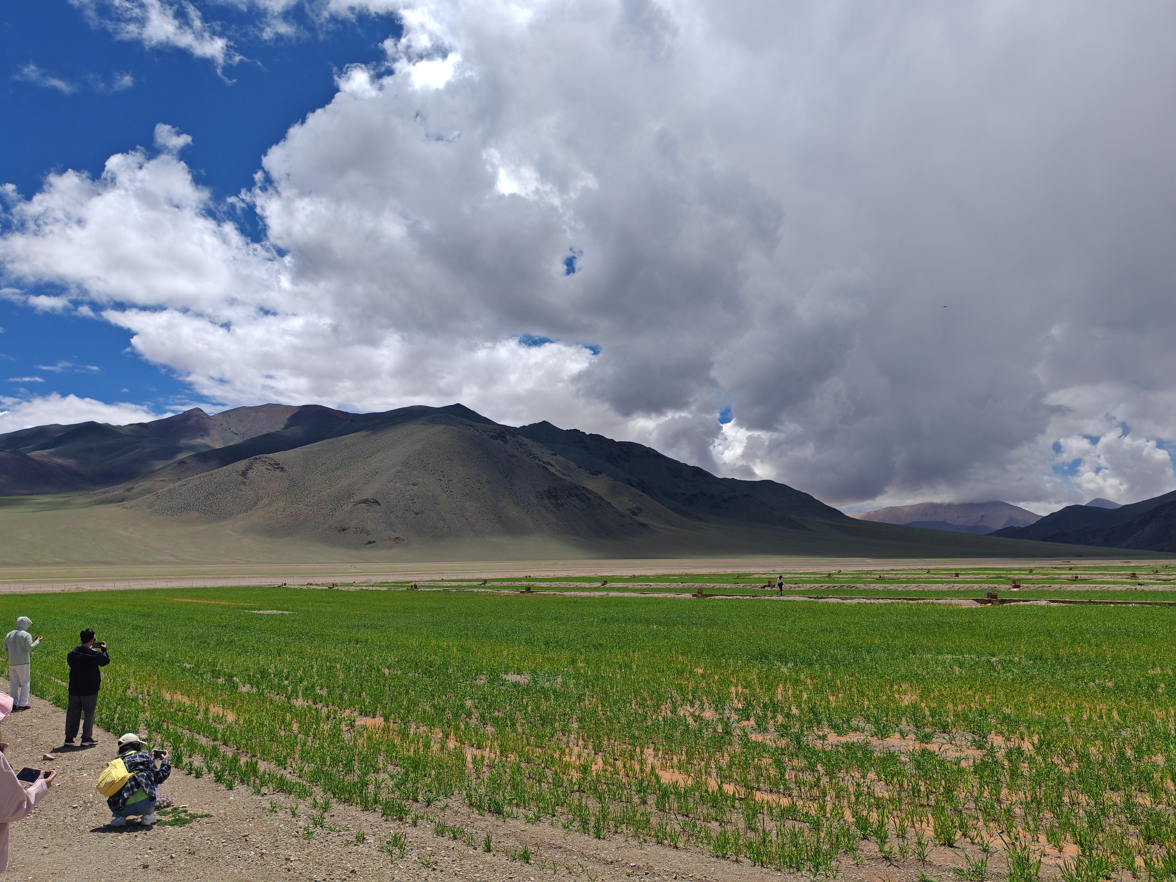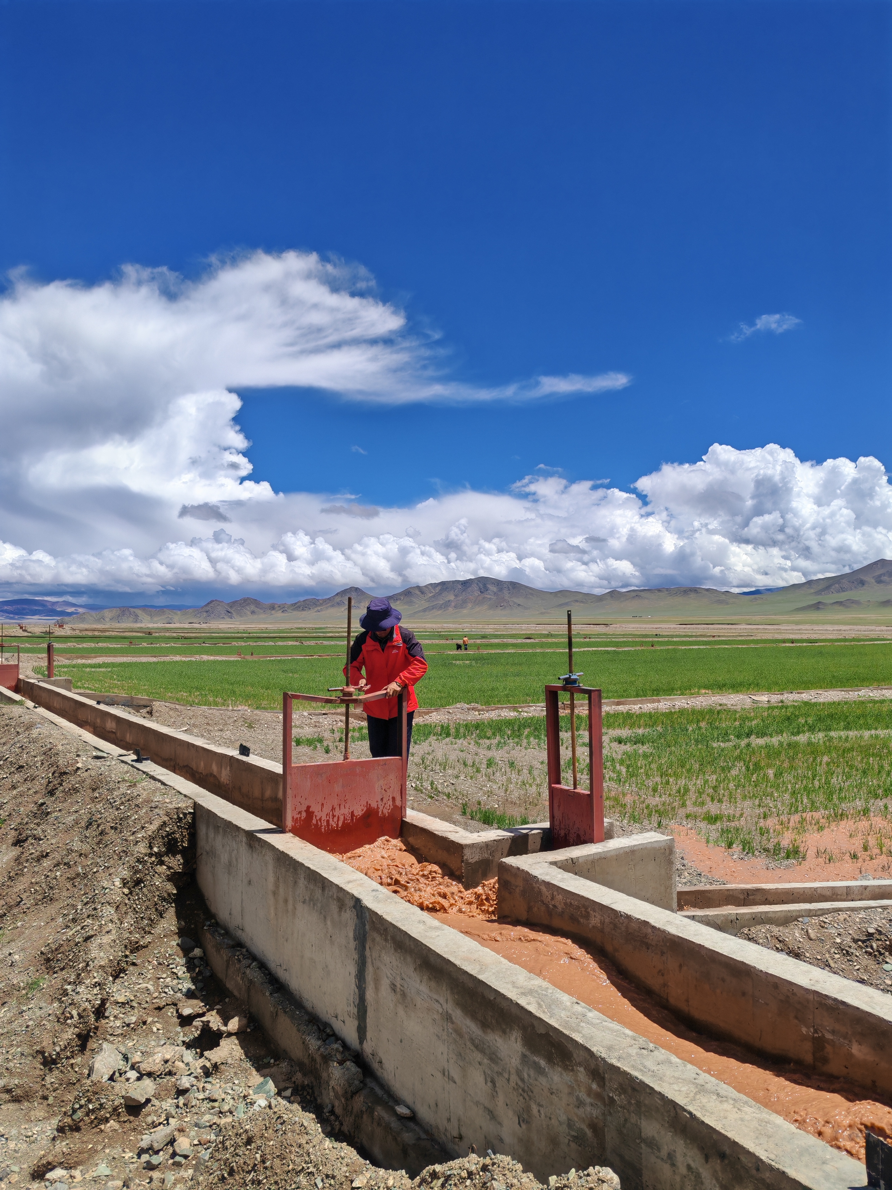 “你现在看到的绿油油的草,都是人工种植的。过去这里产业单一,村民们基本以畜牧业为主,但一到冬天,常常会发生牲畜用草困难。”拉巴欧珠介绍,文布当桑乡地处革吉县东部,夏季冰川融水与山间降雨给当地河谷带来丰沛水源。此前,当地居民按照传统畜牧方式生活,2016年起,乡政府利用山谷间的地理环境优势,在距乡政府19公里的荒滩上,规划建设人工种草基地,并通过分包方式承包给村民,不仅减轻了天然草场压力,也带动了村民就业增收。